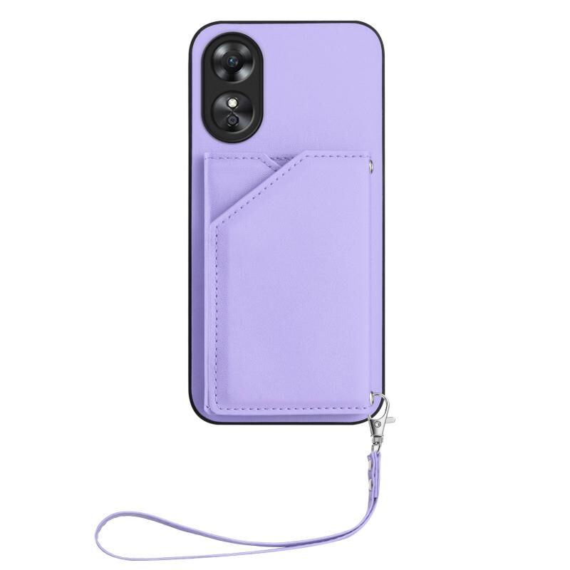 Θήκη τηλεφώνου για OPPO A17 με αίσθηση δέρματος, τέσσερις θήκες καρτών και λουρί καρπού (Μωβ)