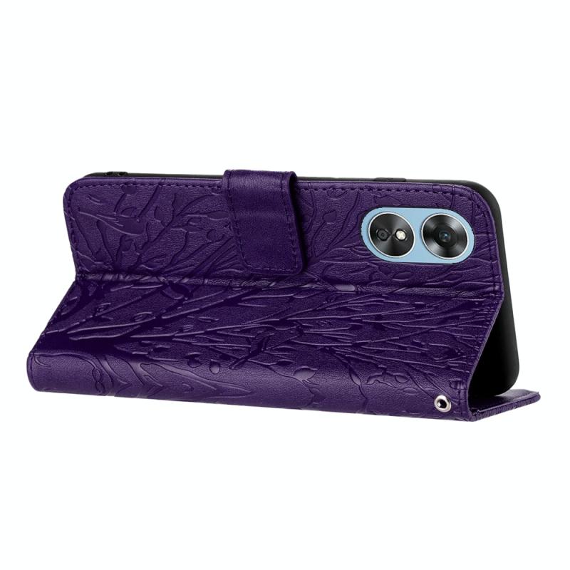 For OPPO A17 Tree Birds Embossed Pattern Leather Phone Case(Purple)