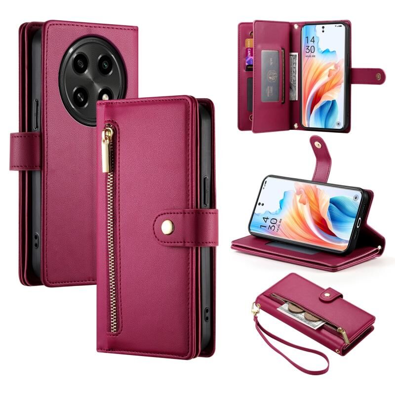 Θήκη τηλεφώνου από δέρμα με θήκη πορτοφολιού με φερμουάρ και εννέα υποδοχές καρτών για OPPO A2 Pro (Κόκκινο)