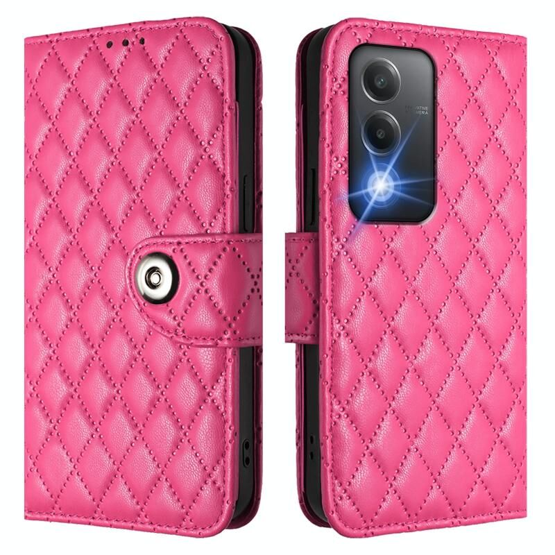 Για OPPO A3 Pro 5G Ινδία Rhombic υφή Flip δέρμα τηλέφωνο υπόθεση με κορδόνι (Ροζέ κόκκινο)