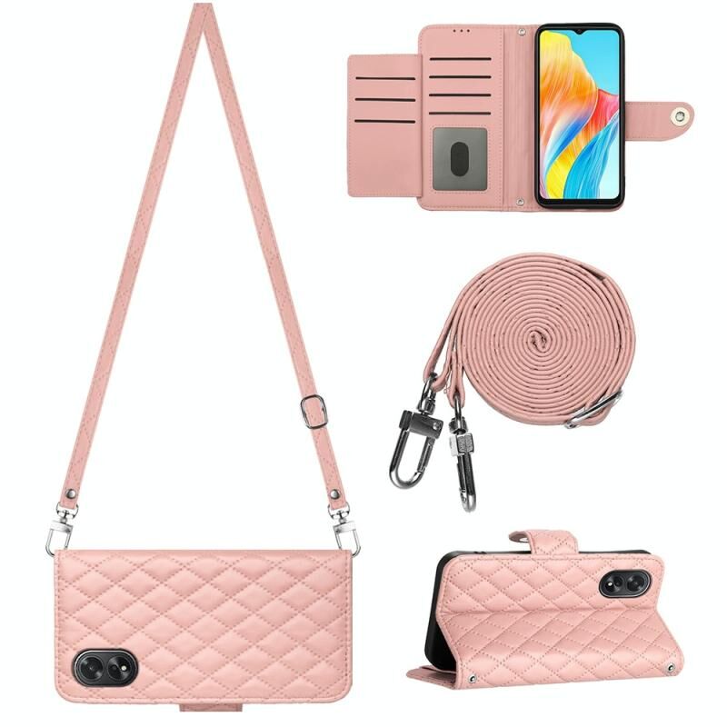 Για OPPO A38 4G / A18 4G Rhombic υφή Flip δερμάτινη θήκη τηλεφώνου με μακρύ κορδόνι (Coral Pink)
