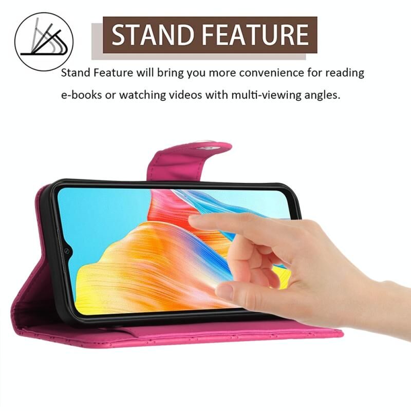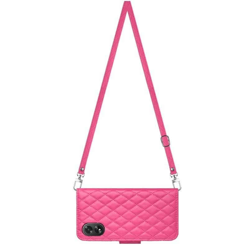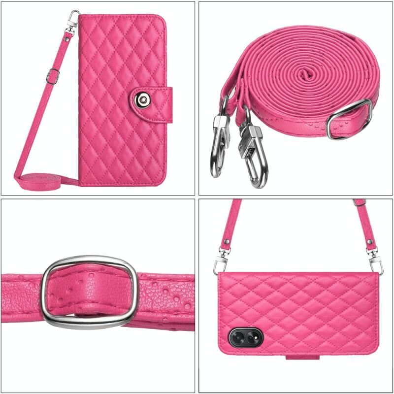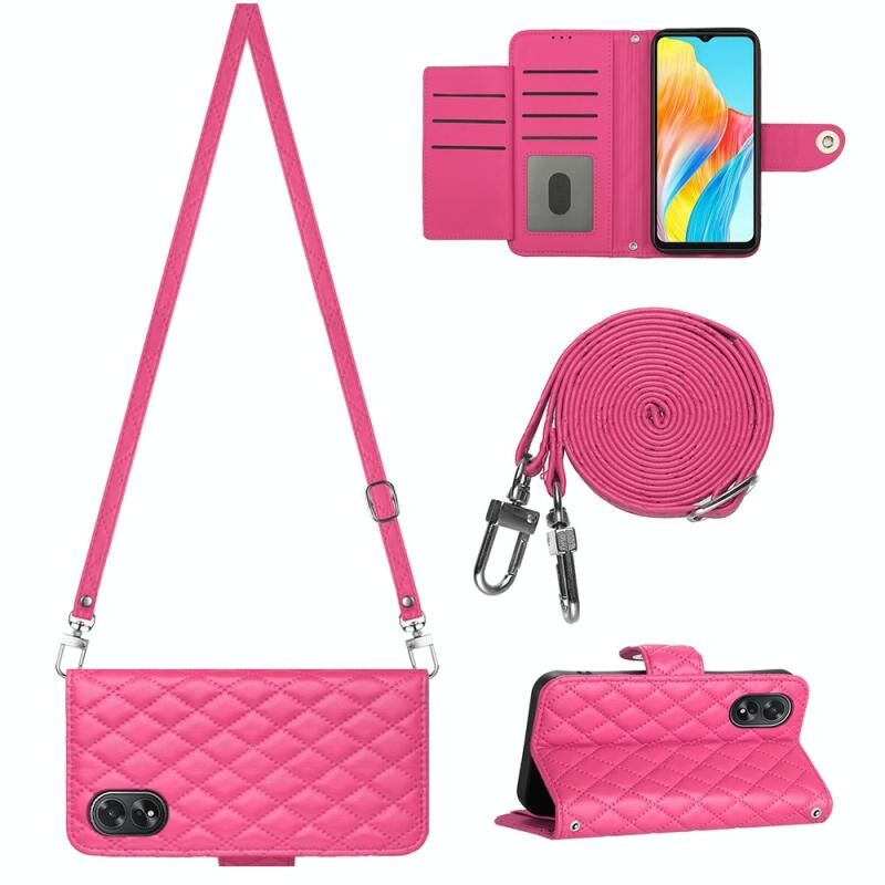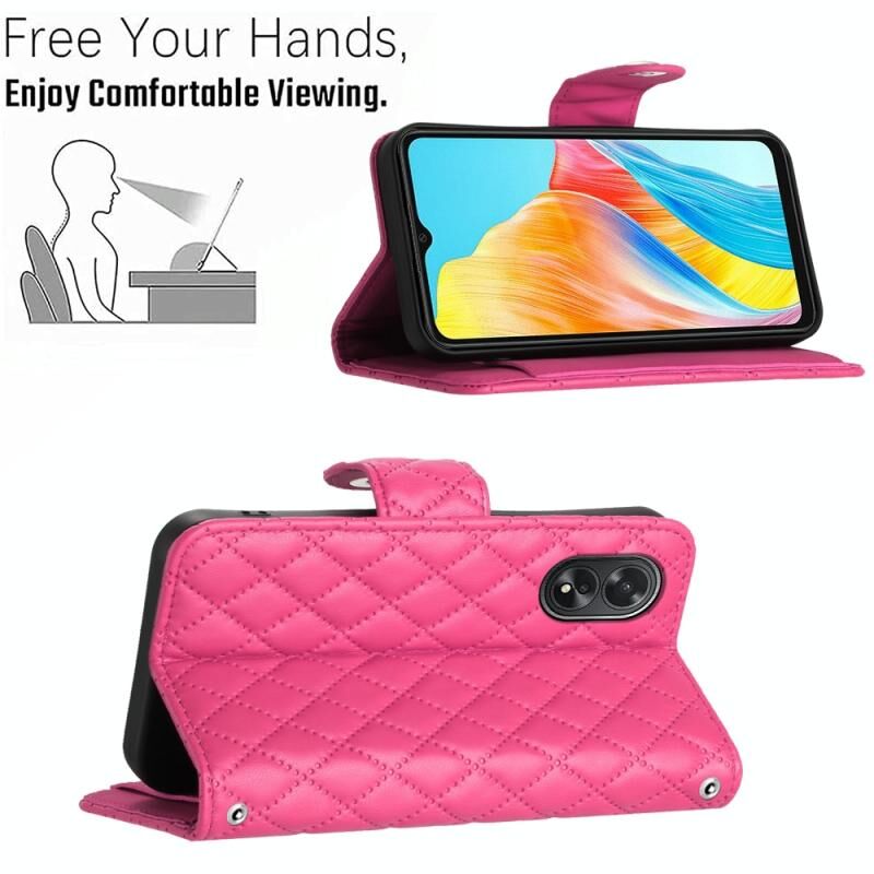 Για OPPO A38 4G / A18 4G Rhombic υφή Flip δερμάτινη θήκη τηλεφώνου με μακρύ κορδόνι (Rose Red)