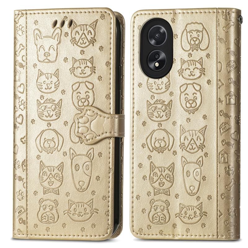 Θήκη τηλεφώνου από δέρμα με ανάγλυφα σχέδια γάτας και σκύλου για OPPO A38 (Χρυσός)
