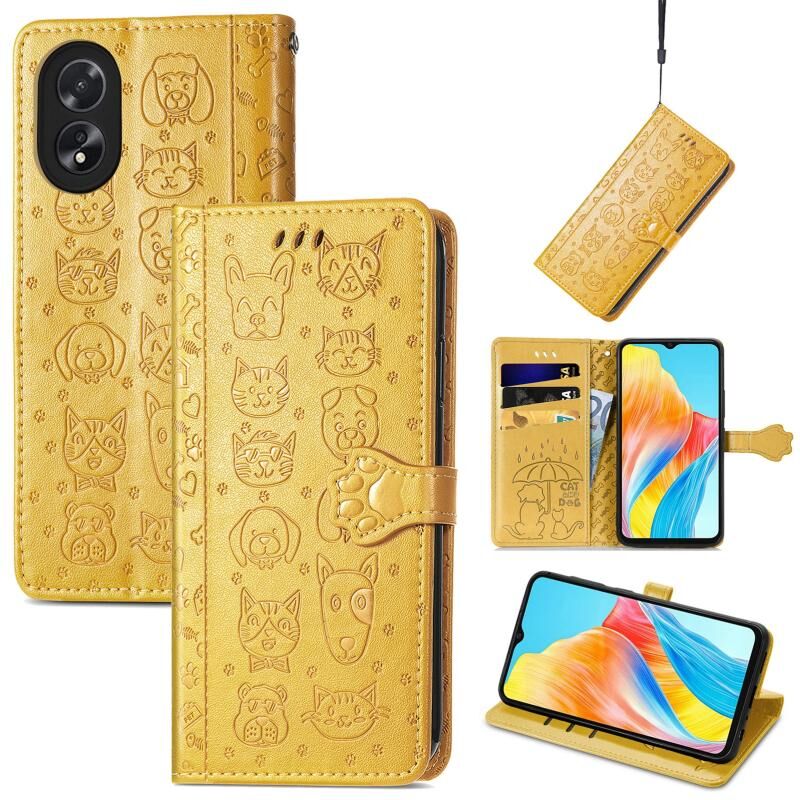 Θήκη τηλεφώνου από δέρμα με ανάγλυφα σχέδια γάτας και σκύλου για OPPO A38 (Κίτρινο)