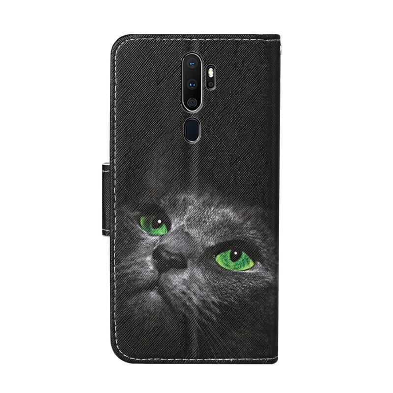 Θήκη δέρματος οριζόντιας αναδίπλωσης με σχέδια ζωγραφικής και χρώματα για OPPO A5 (2020) με βάση στήριξης & υποδοχές καρτών & πορτοφόλι (Σχέδιο Γάτας)