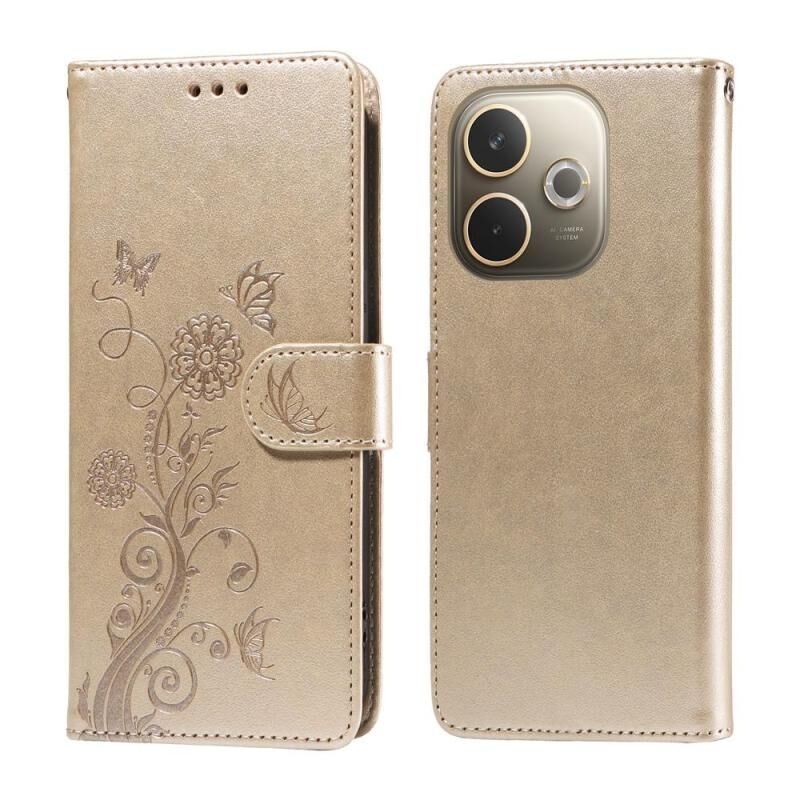 Θήκη τηλεφώνου από δέρμα με ανάγλυφα σχέδια πεταλούδας και λουλουδιών για OPPO A5 Pro 5G (Χρυσός)