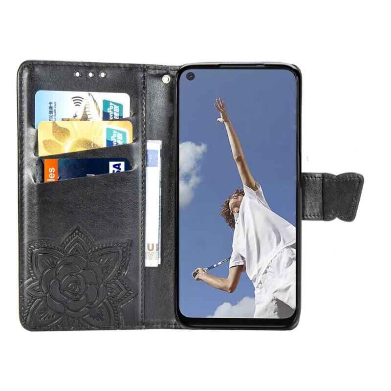 Θήκη δέρματος οριζόντιας αναδίπλωσης με ανάγλυφο σχέδιο πεταλούδας και λουλουδιών για OPPO A52/A72/A92, με βάση στήριξης / υποδοχή κάρτας / πορτοφόλι / κορδόνι (Μαύρο)