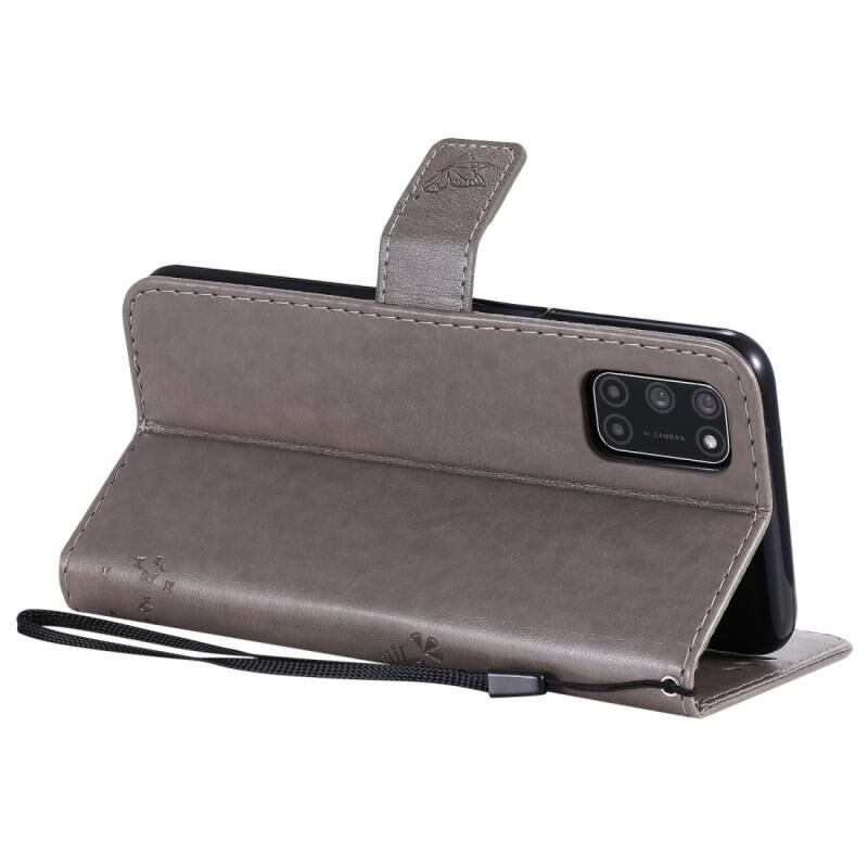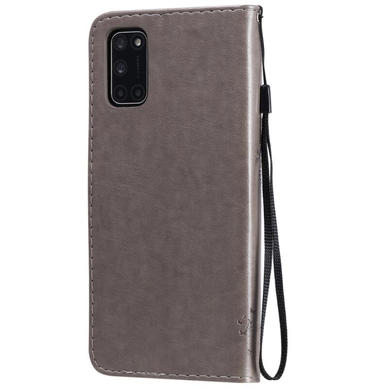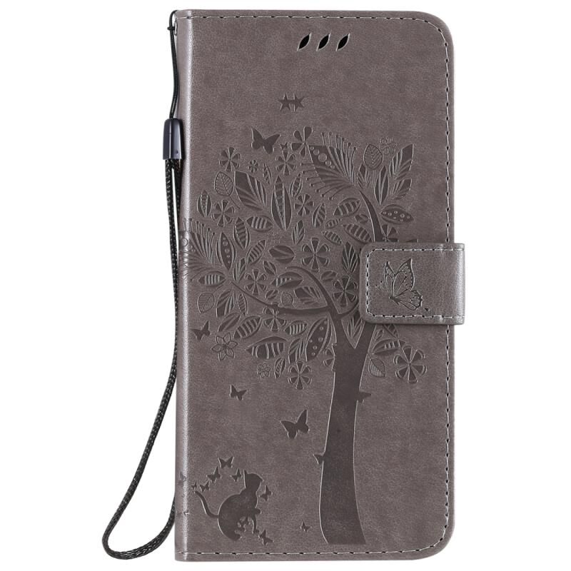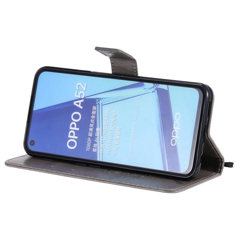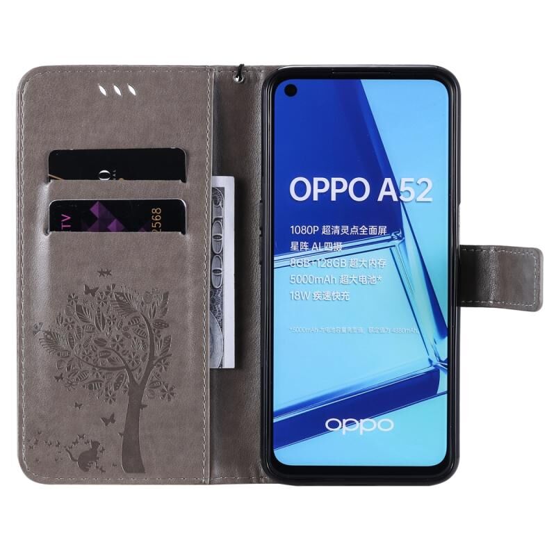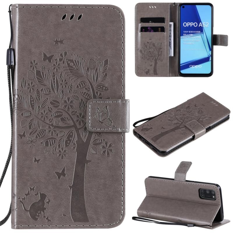 Θήκη δέρματος οριζόντιας αναδίπλωσης με ανάγλυφο σχέδιο δέντρου & γάτας για Oppo A52 / A72 / A92 με βάση στήριξης & υποδοχές καρτών & πορτοφόλι & κορδόνι (Γκρι)