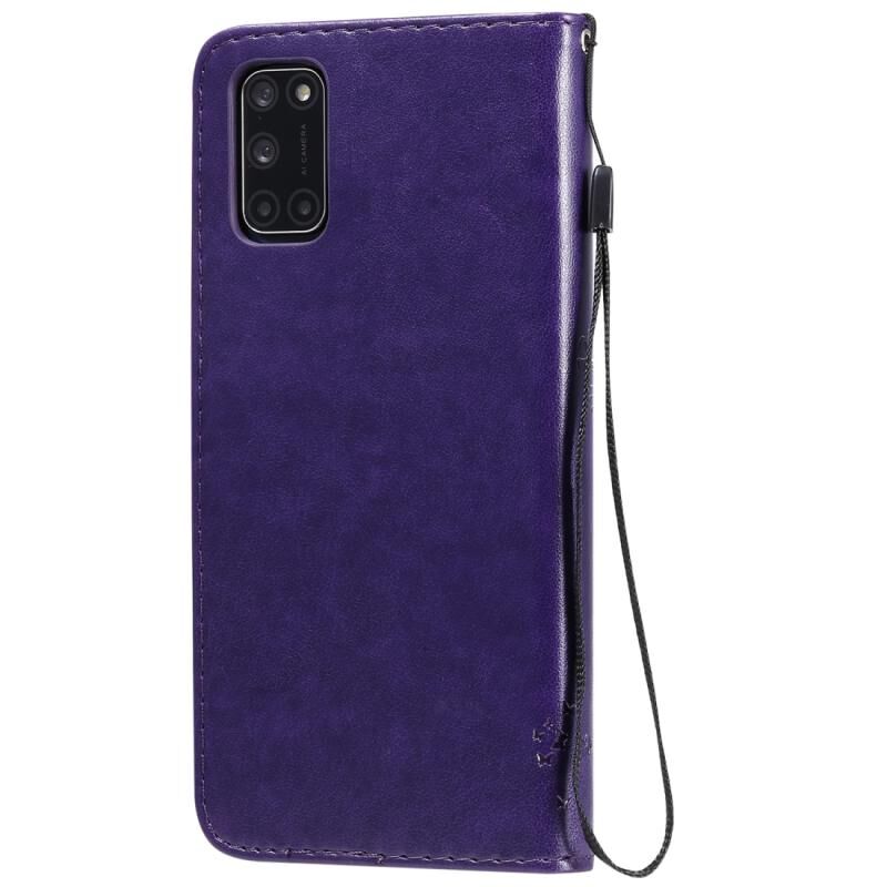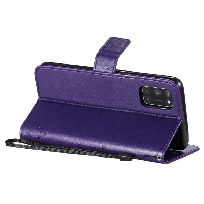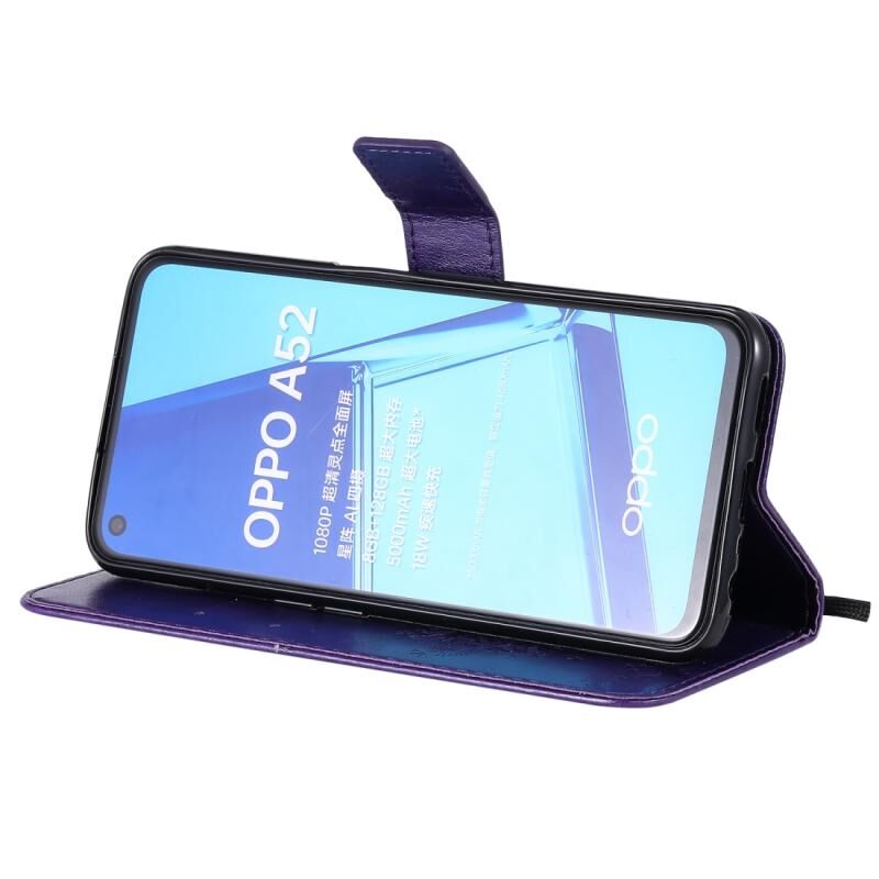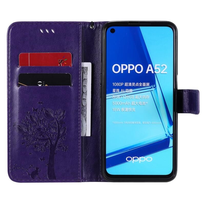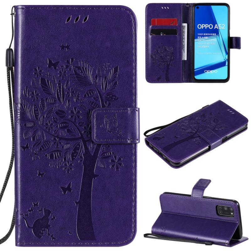 Θήκη δέρματος οριζόντιας αναδίπλωσης με ανάγλυφο σχέδιο δέντρου & γάτας για Oppo A52 / A72 / A92 με βάση στήριξης & υποδοχές καρτών & πορτοφόλι & κορδόνι (Μωβ)