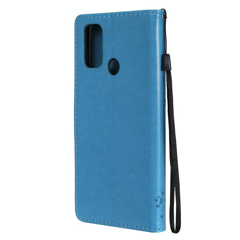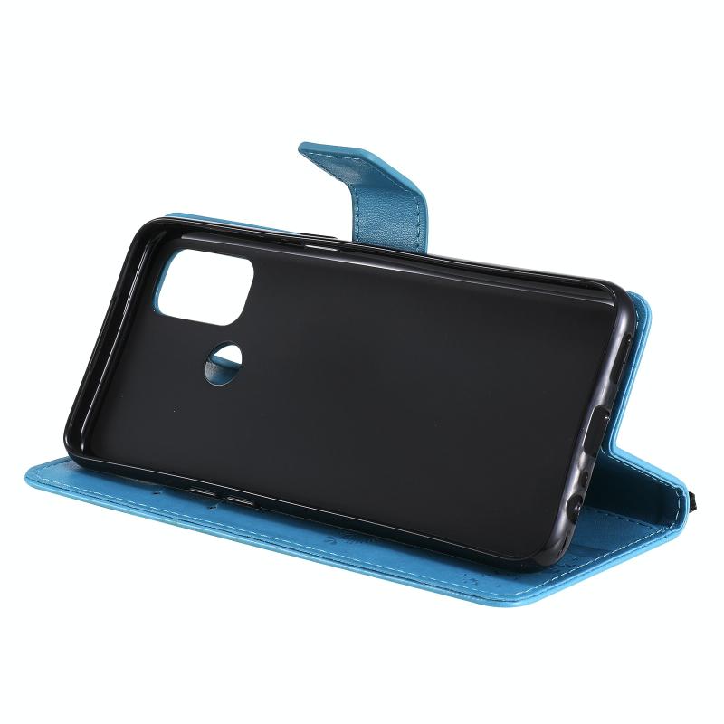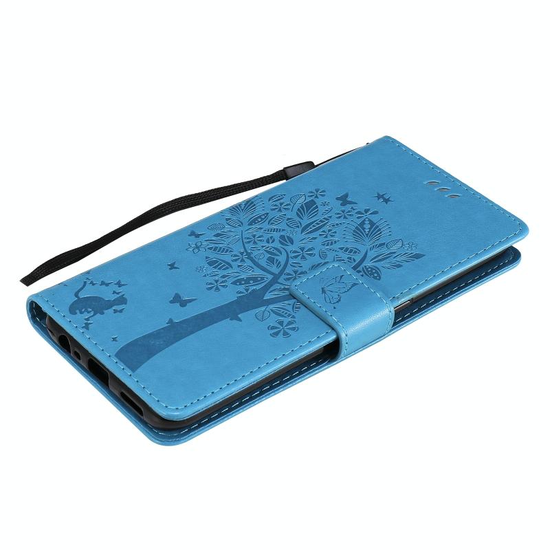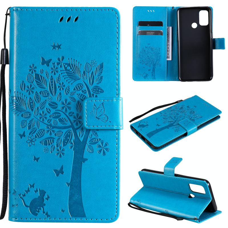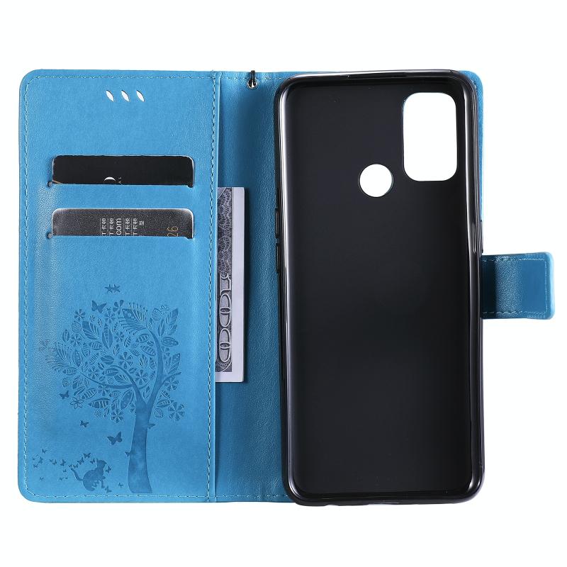 Θήκη για OPPO A53(2020) / A32 με σχέδιο Δέντρου & Γάτας, εκτυπωμένη με θερμοτύπηση, οριζόντια, από δερματίνη PU με βάση στήριξης & θήκες για κάρτες & πορτοφόλι & κορδόνι (Μπλε)