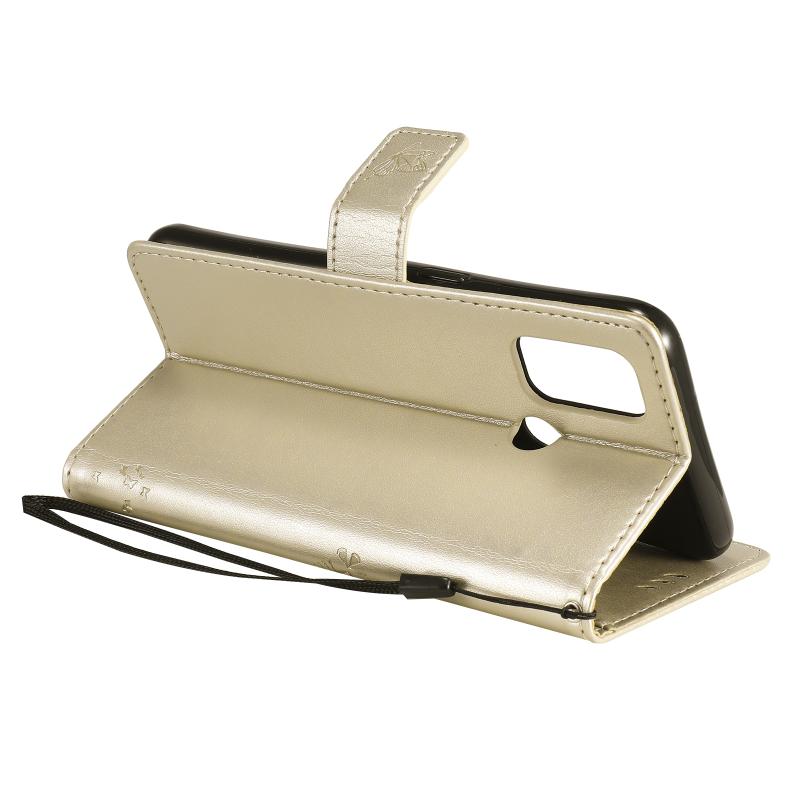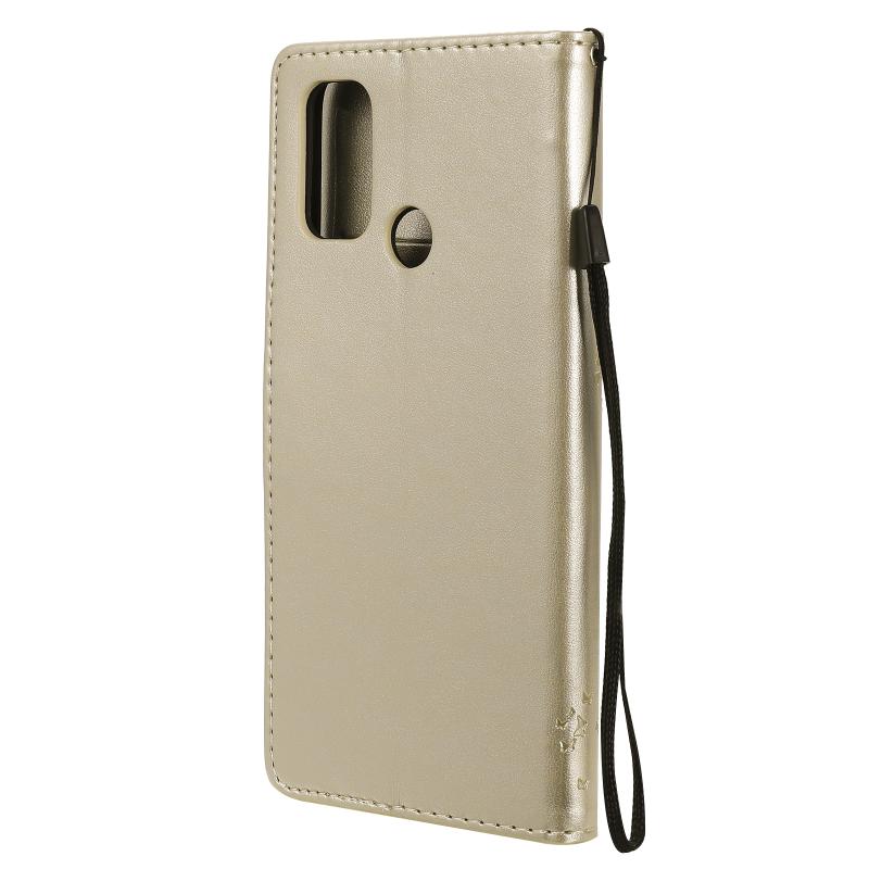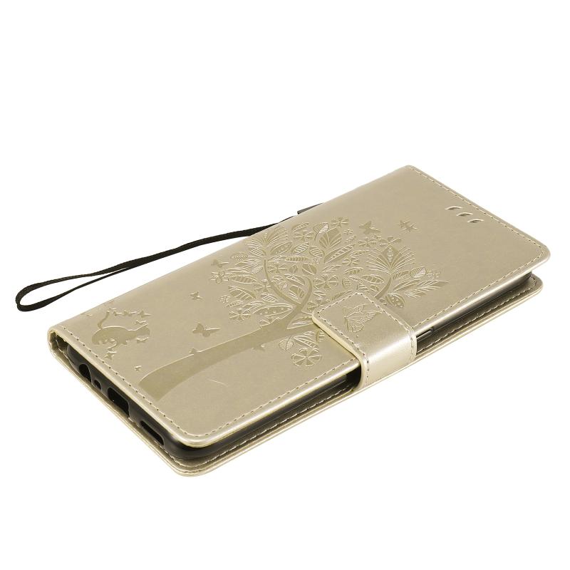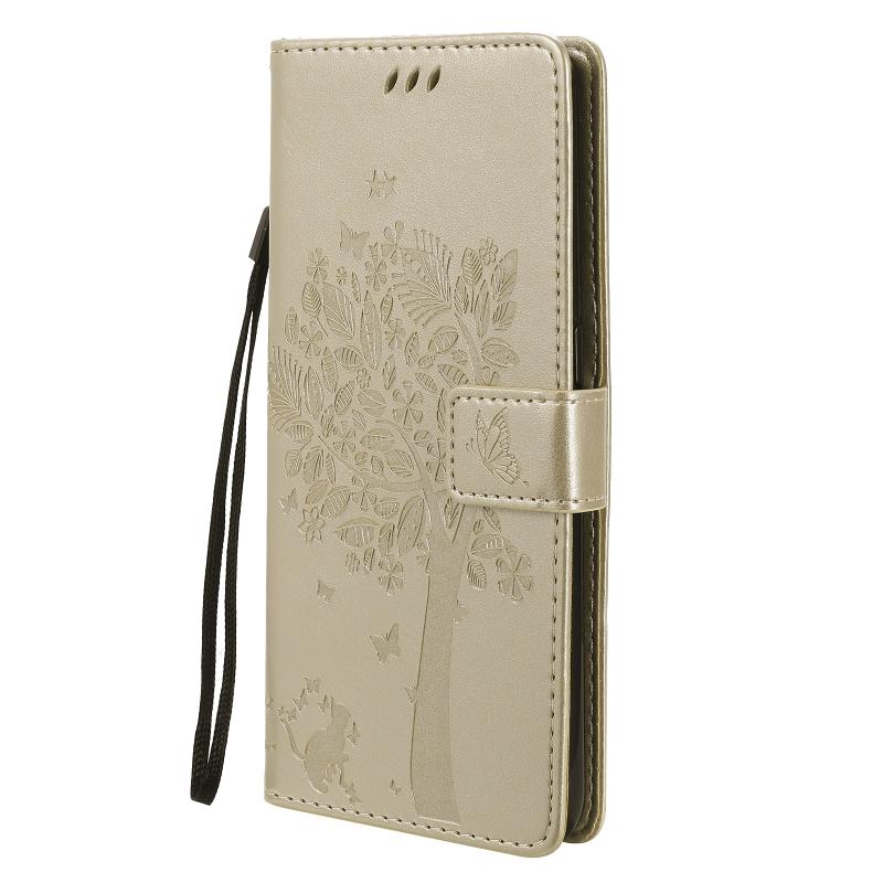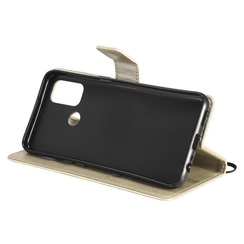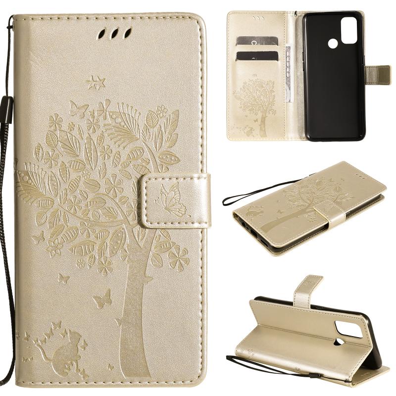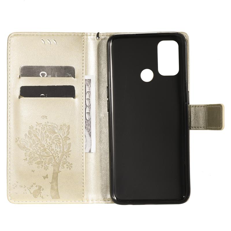 Θήκη για OPPO A53(2020) / A32 με σχέδιο Δέντρου & Γάτας, εκτυπωμένη με θερμοτύπηση, οριζόντια, από δερματίνη PU με βάση στήριξης & θήκες για κάρτες & πορτοφόλι & κορδόνι (Χρυσό)