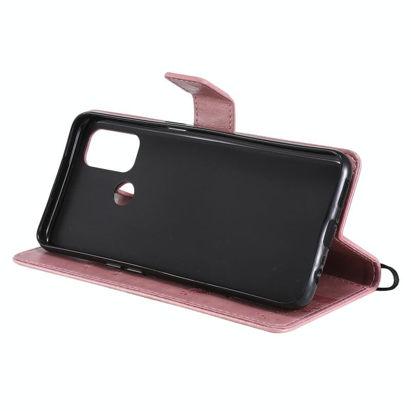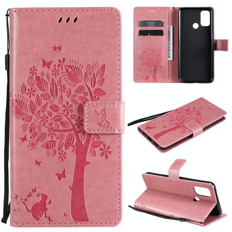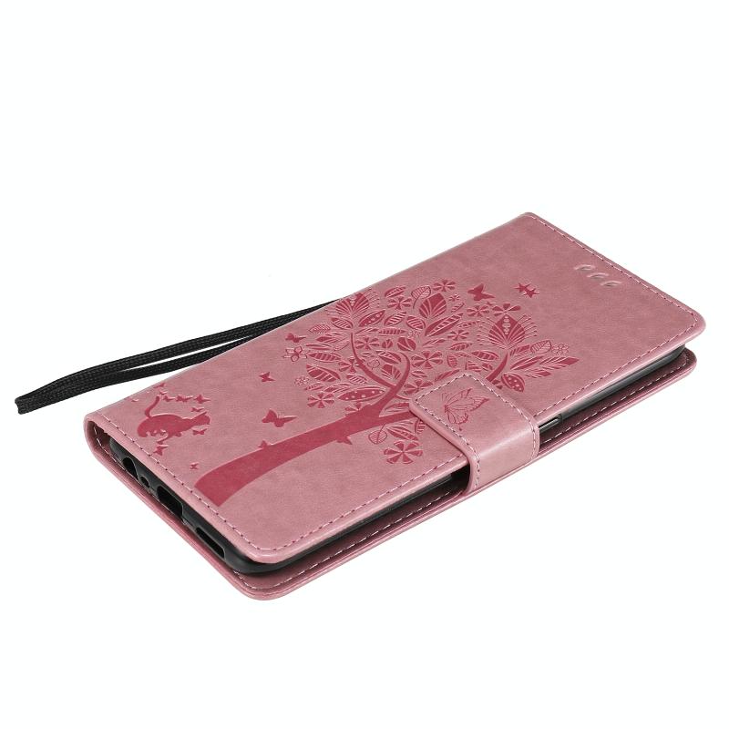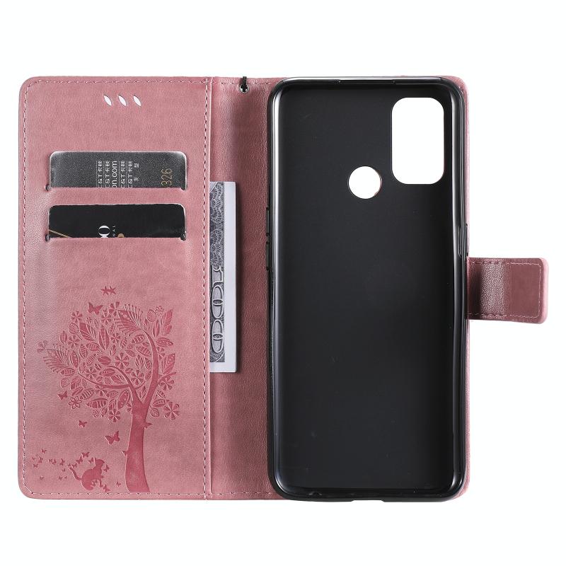 Θήκη για OPPO A53(2020) / A32 με σχέδιο Δέντρου & Γάτας, εκτυπωμένη με θερμοτύπηση, οριζόντια, από δερματίνη PU με βάση στήριξης & θήκες για κάρτες & πορτοφόλι & κορδόνι (Χρυσό)