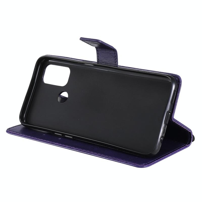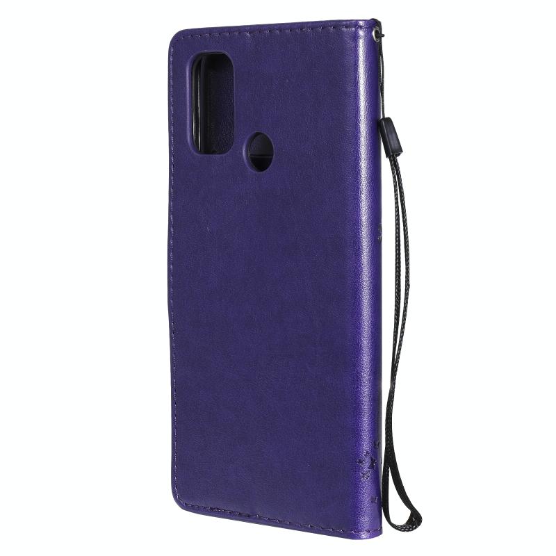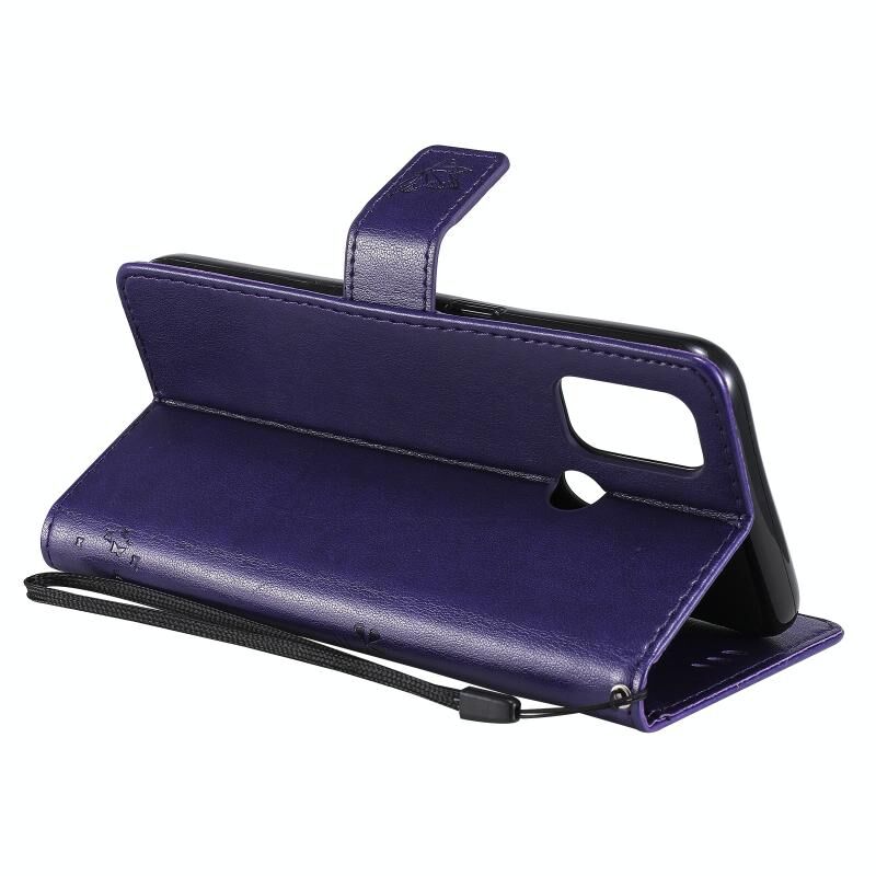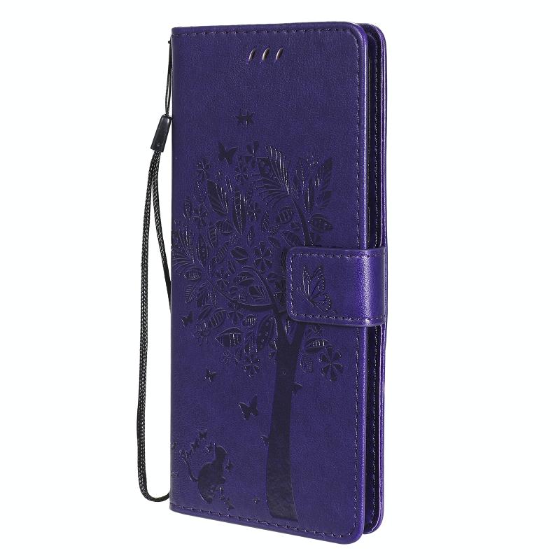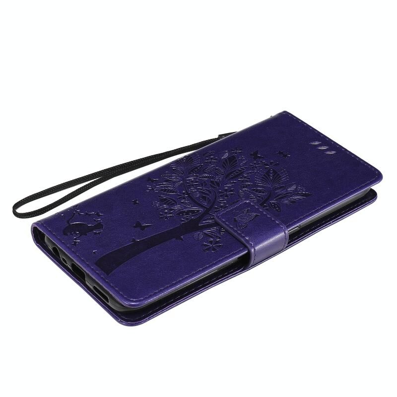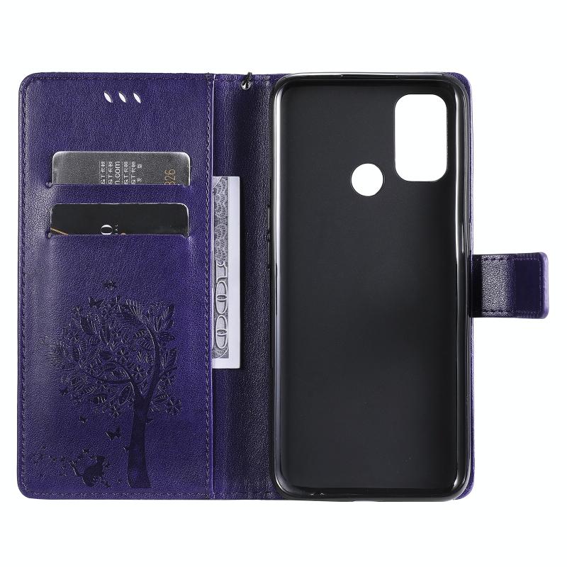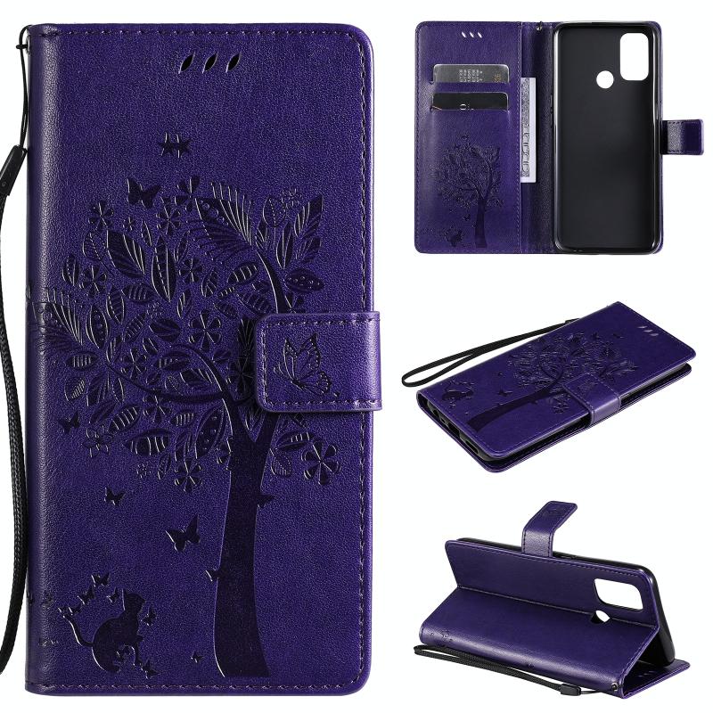 Θήκη για OPPO A53(2020) / A32 με σχέδιο Δέντρου & Γάτας, εκτυπωμένη με θερμοτύπηση, οριζόντια, από δερματίνη PU με βάση στήριξης & θήκες για κάρτες & πορτοφόλι & κορδόνι (Μωβ)