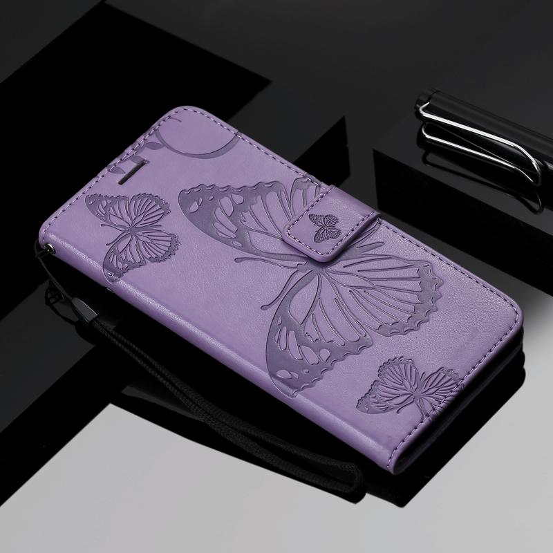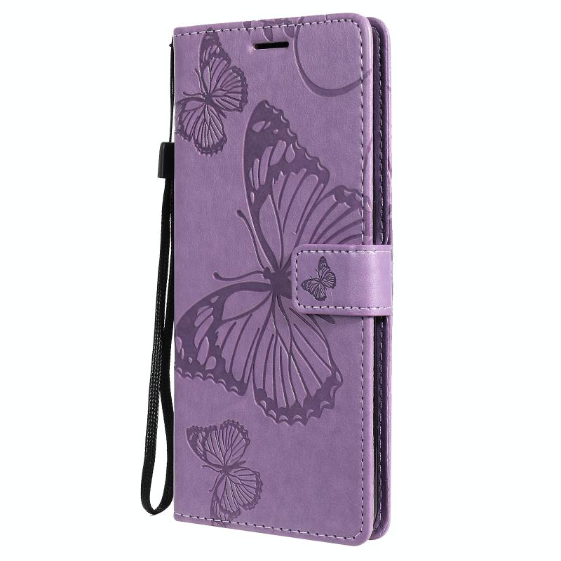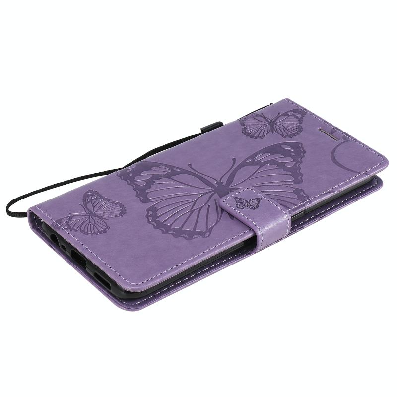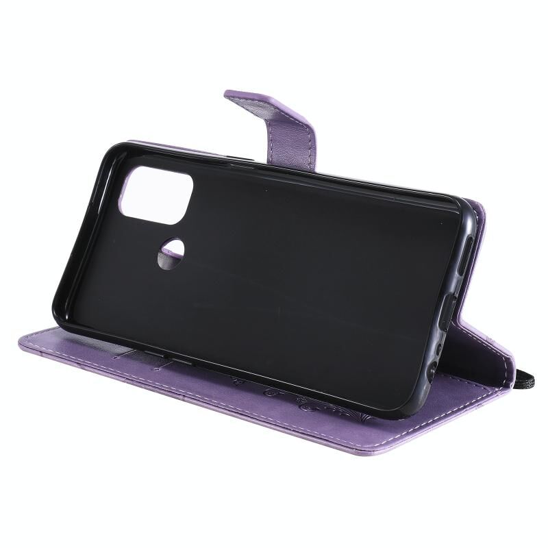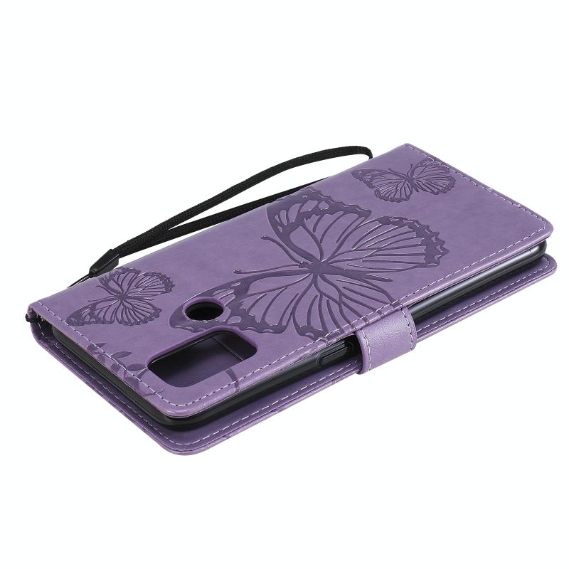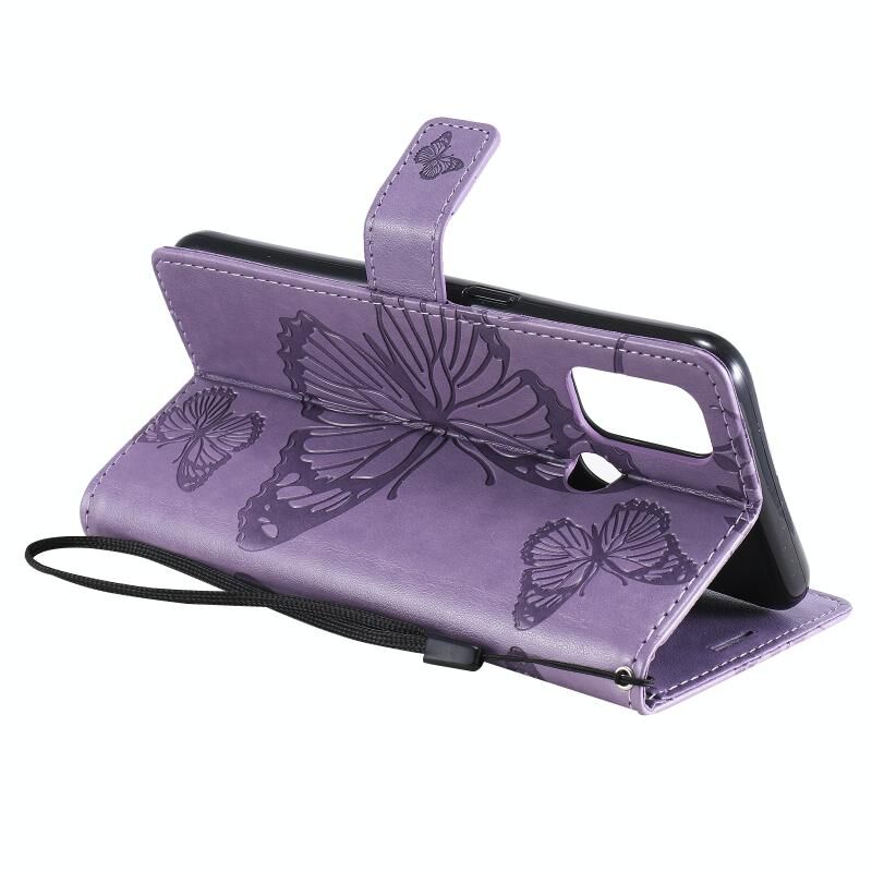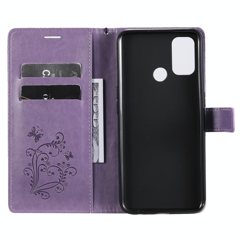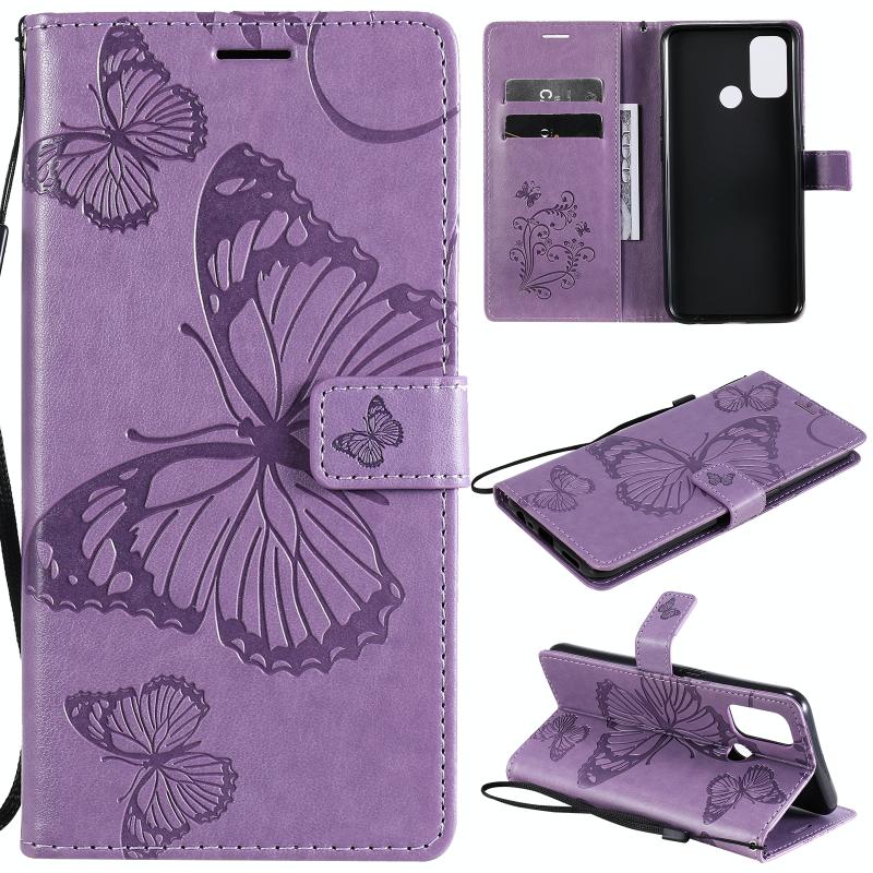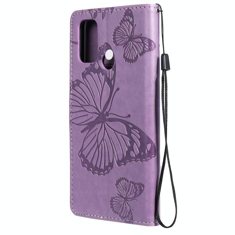 Θήκη βιβρίου από δέρμα με οριζόντιο άνοιγμα, με ανάγλυφο σχέδιο 3D πεταλούδων, για OPPO A53 (2020) / A53s / A33 (2020) / A32, με βάση στήριξης & θήκη για κάρτες & πορτοφόλι (Μωβ)