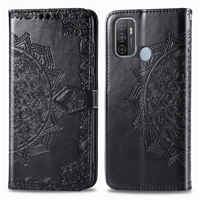 Για το OPPO A53 2020 Θήκη Δέρματος Οριζόντιας Αναδίπλωσης με Χαρακτό Μαντάλα Λουλουδιών με Στήριγμα / Υποδοχή Κάρτας / Πορτοφόλι / Λουρί (Μαύρο)