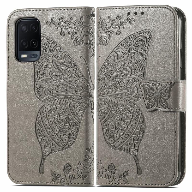 Για OPPO A54 4G πεταλούδα αγάπη λουλούδια ανάγλυφο οριζόντια Flip δερμάτινη θήκη με κάτοχο & υποδοχές για κάρτες & πορτοφόλι & κορδόνι (γκρι)