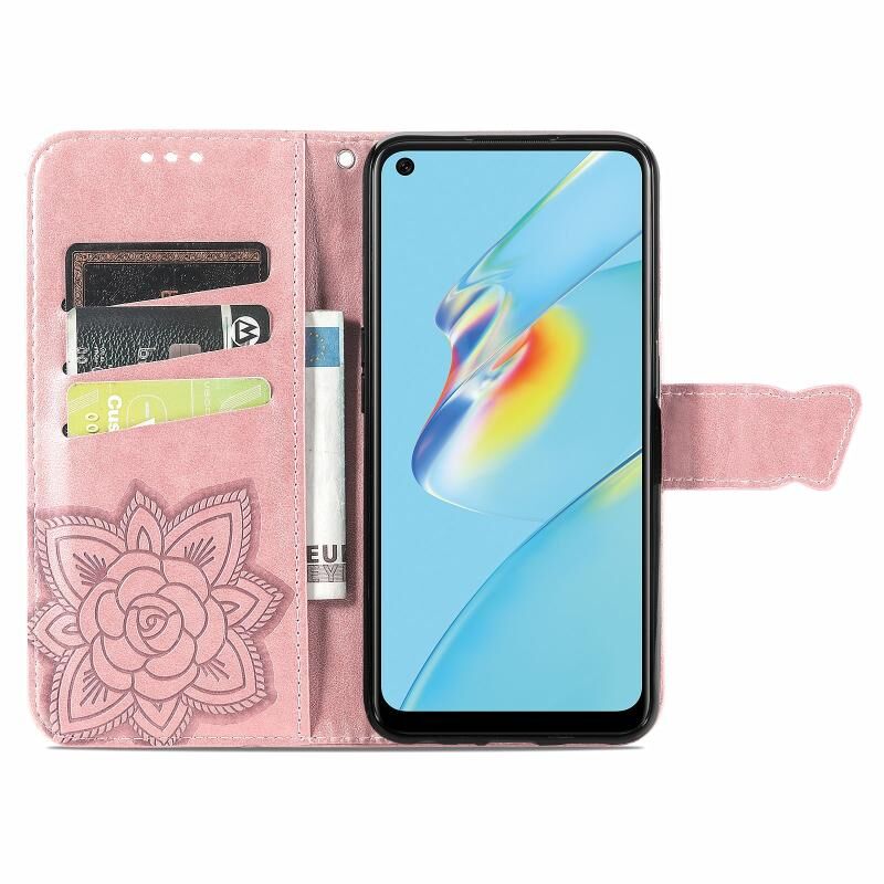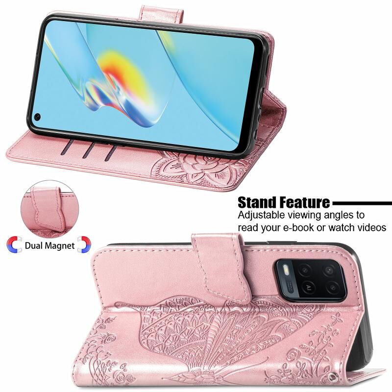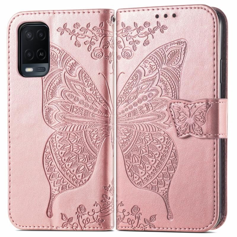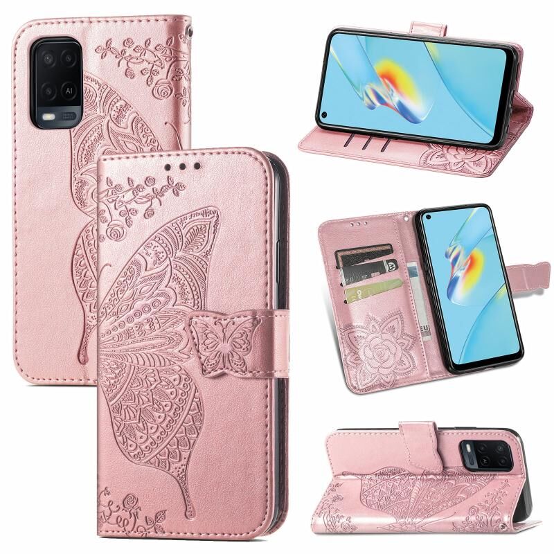 Για OPPO A54 4G πεταλούδα αγάπη λουλούδια ανάγλυφο οριζόντια Flip δερμάτινη θήκη με κάτοχο & υποδοχές για κάρτες & πορτοφόλι & κορδόνι (Rose Gold)