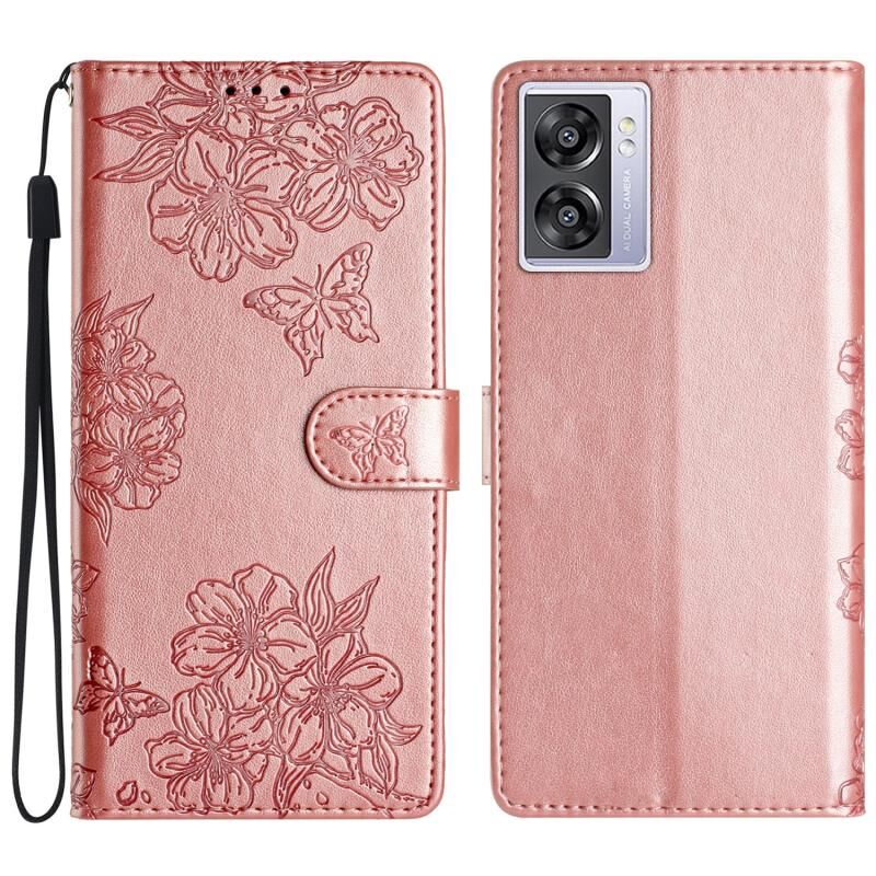 Θήκη τηλεφώνου OPPO A57 4G / A57 5G / A77 5G με ανάγλυφο PU υφή Cherry Blossom Butterfly (Κόκκινο)
