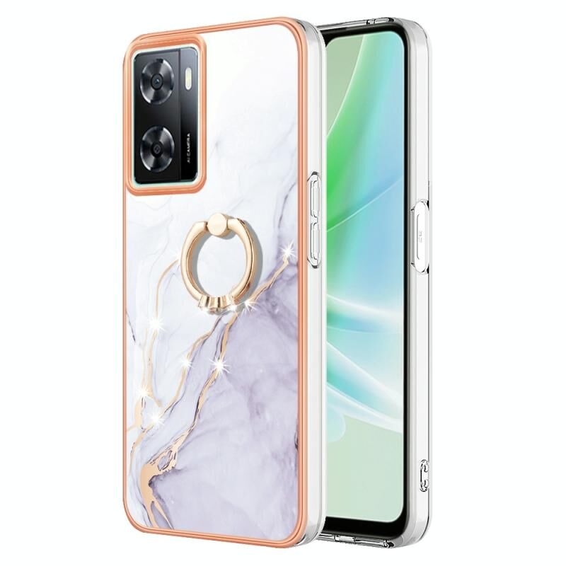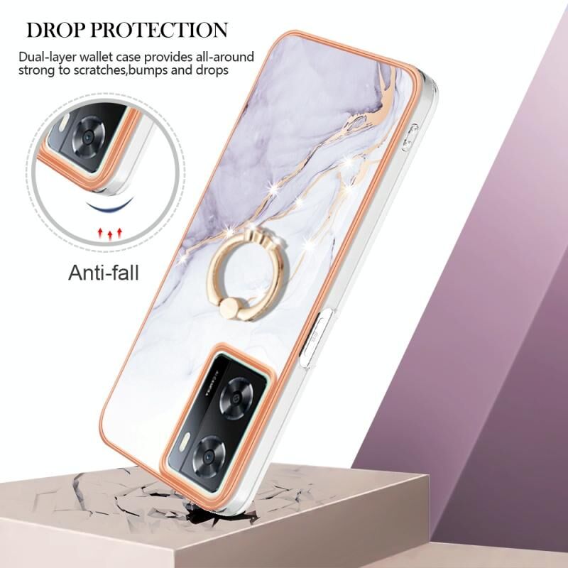 Θήκη κινητού τηλεφώνου OPPO A57 4G/A77 5G Ταϊβάν/K10 5G Global με ηλεκτρολυτική επικάλυψη, σχέδιο μάρμαρου IMD, από TPU με δακτύλιο στήριξης (Λευκό 006)