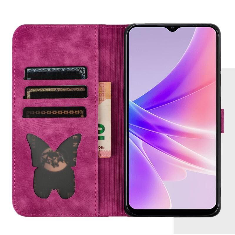 Θήκη τηλεφώνου από δέρμα με ανάγλυφο σχέδιο πεταλούδας και γάτας για OPPO A57 5G / A77 5G (ρόζ)