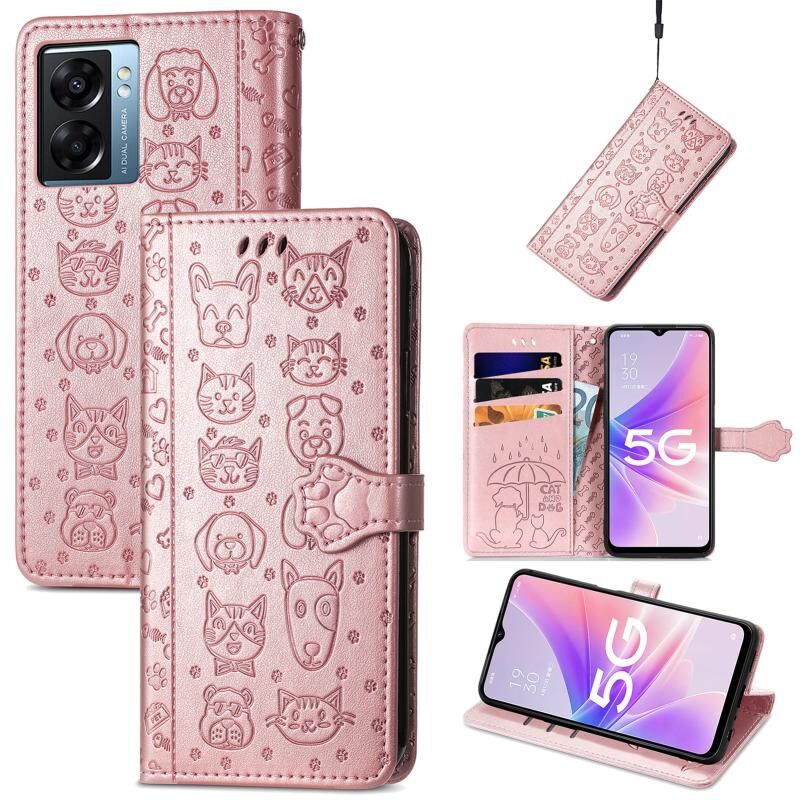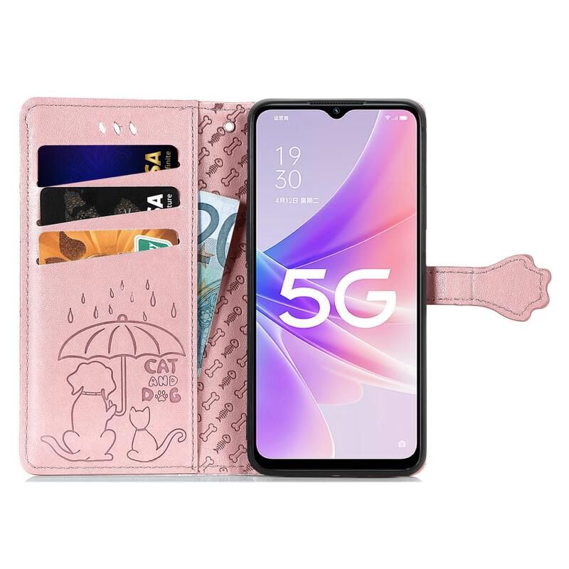 Θήκη δέρματος οριζόντιας αναδίπλωσης με ανάγλυφα σχέδια χαριτωμένων γάτας και σκύλου για OPPO A57 5G (Ροζ χρυσός)