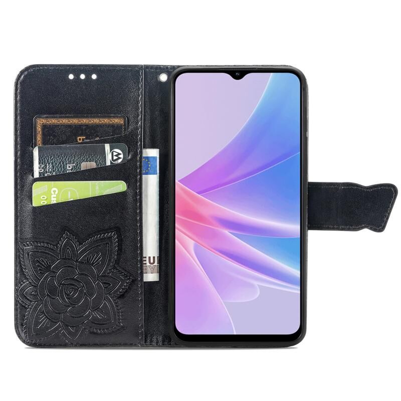 Θήκη τηλεφώνου από δέρμα με ανάγλυφο σχέδιο πεταλούδας και λουλουδιών για OPPO A58 4G (Μαύρο)