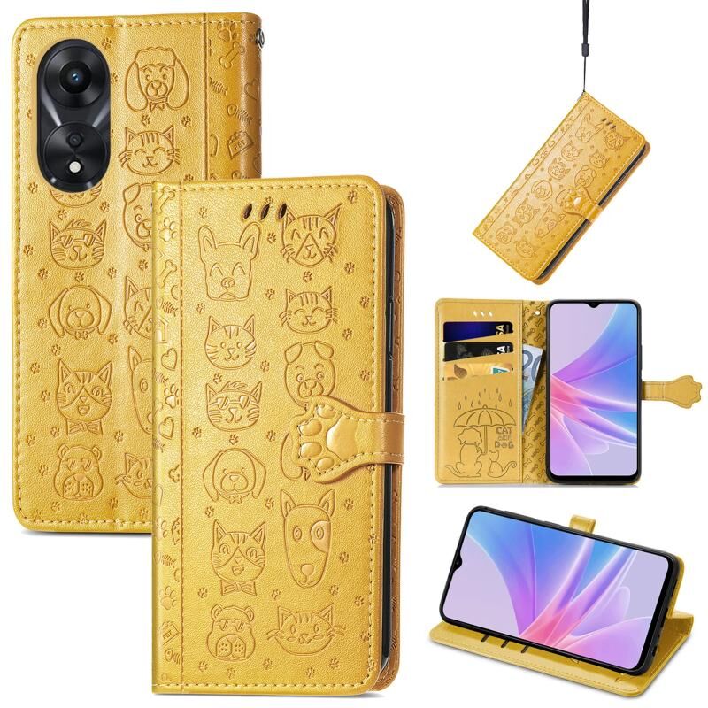 Θήκη τηλεφώνου από δέρμα με ανάγλυφα σχέδια γάτας και σκύλου για OPPO A58 4G (Μωβ)
