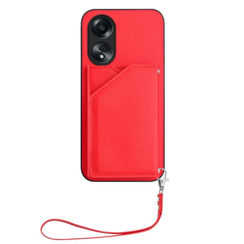 Θήκη τηλεφώνου για OPPO A58 4G Global με αίσθηση δέρματος, τέσσερις υποδοχές καρτών και λουρί καρπού (Κόκκινο)