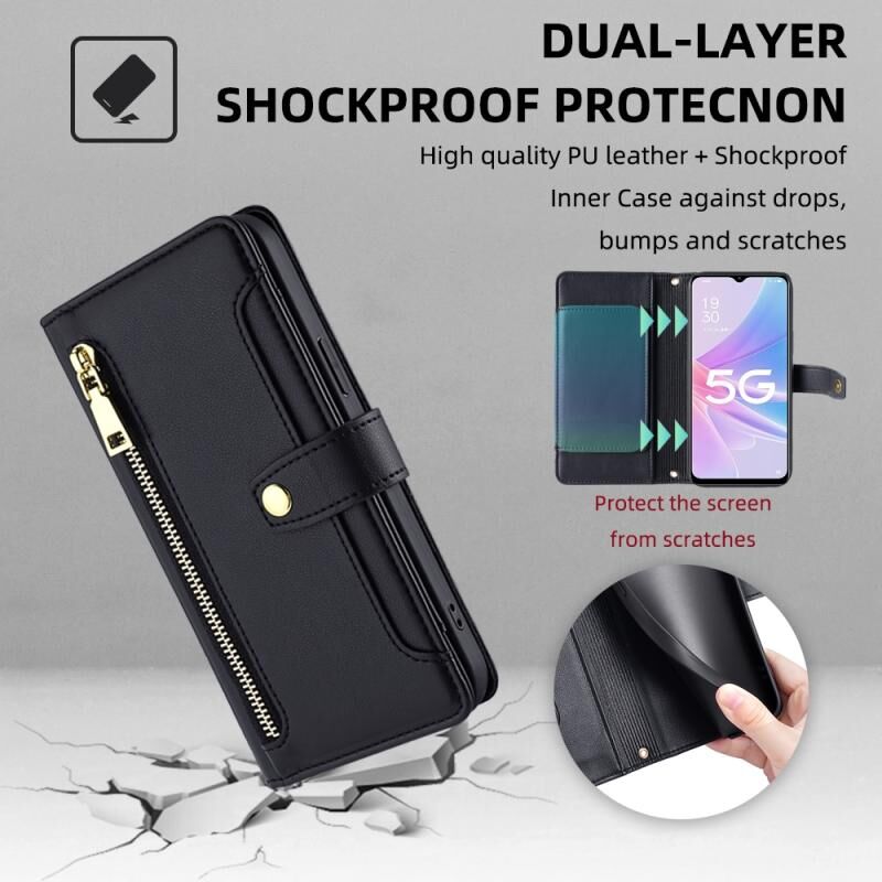 Θήκη τηλεφώνου δερμάτινη με φερμουάρ και σχέδιο αρνιού για OPPO A58 5G (Μαύρο)