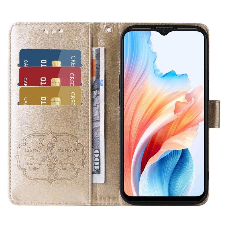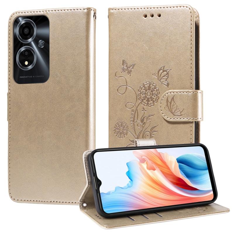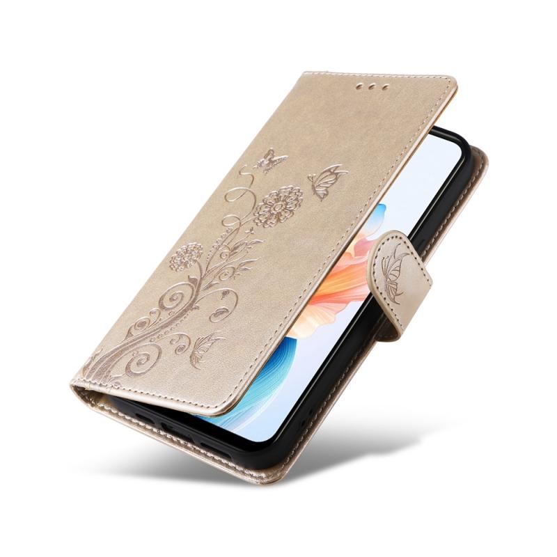 For OPPO A59 5G Embossed Butterfly Flowers Leather Phone Case(Gold)