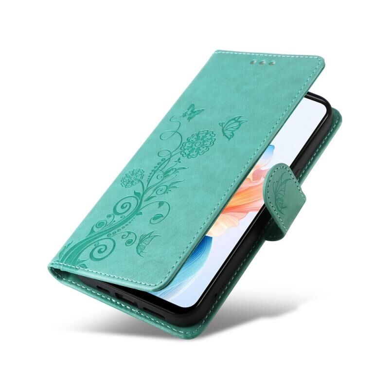 Θήκη τηλεφώνου από δέρμα με ανάγλυφα λουλούδια και πεταλούδες για OPPO A59 5G (Μωβ)