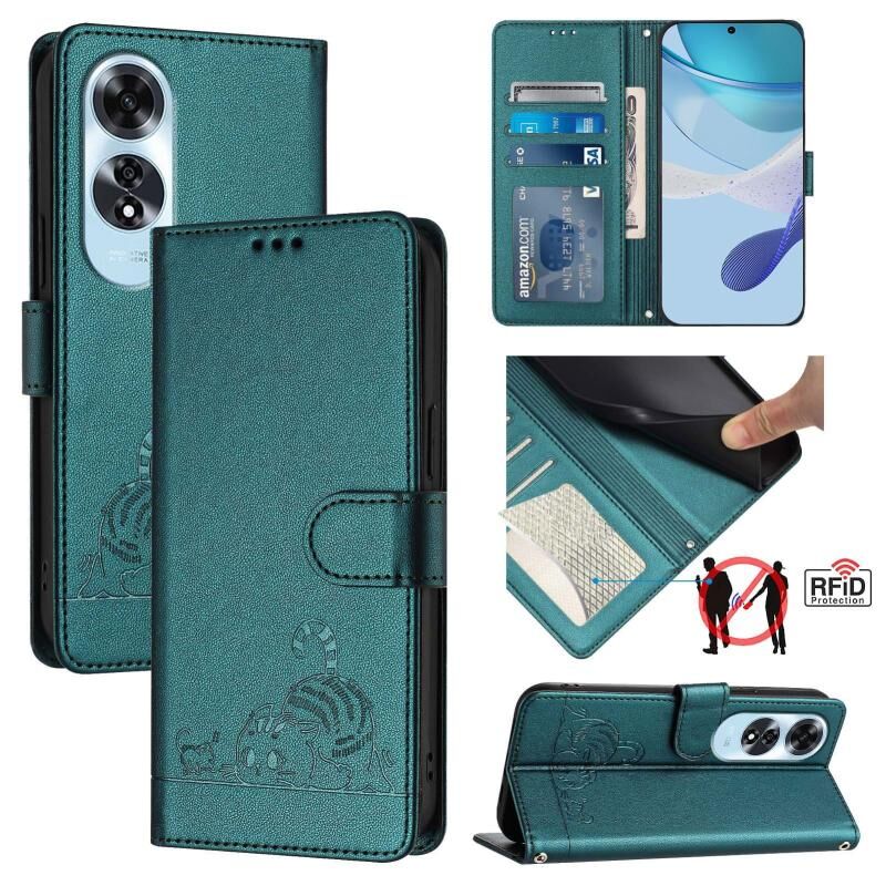 Θήκη τηλεφώνου από δέρμα με ανάγλυφο σχέδιο γάτας και κατσαρίδας RFID για OPPO A60 4G Global με κορδόνι (Πράσινο παγωνιού)