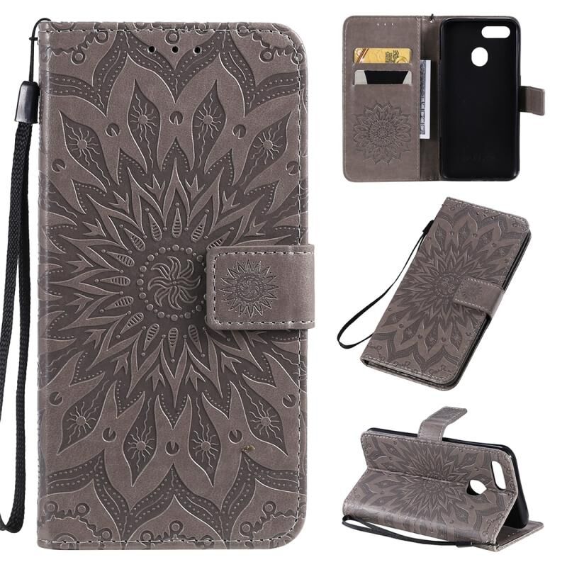 Θήκη για OPPO A7 / A5s με εκτυπωμένο σχέδιο ηλιοτρόπιου, οριζόντια αναδιπλούμενη από δερματίνη PU με βάση στήριξης & θήκες καρτών & πορτοφόλι & κορδόνι (Γκρι)