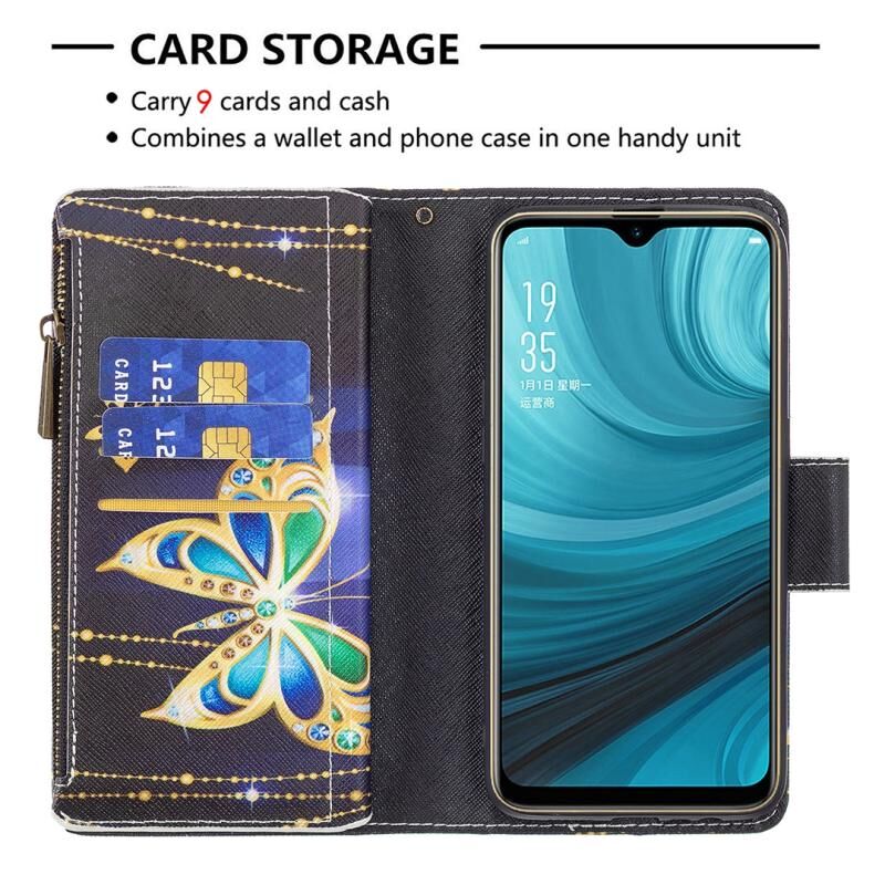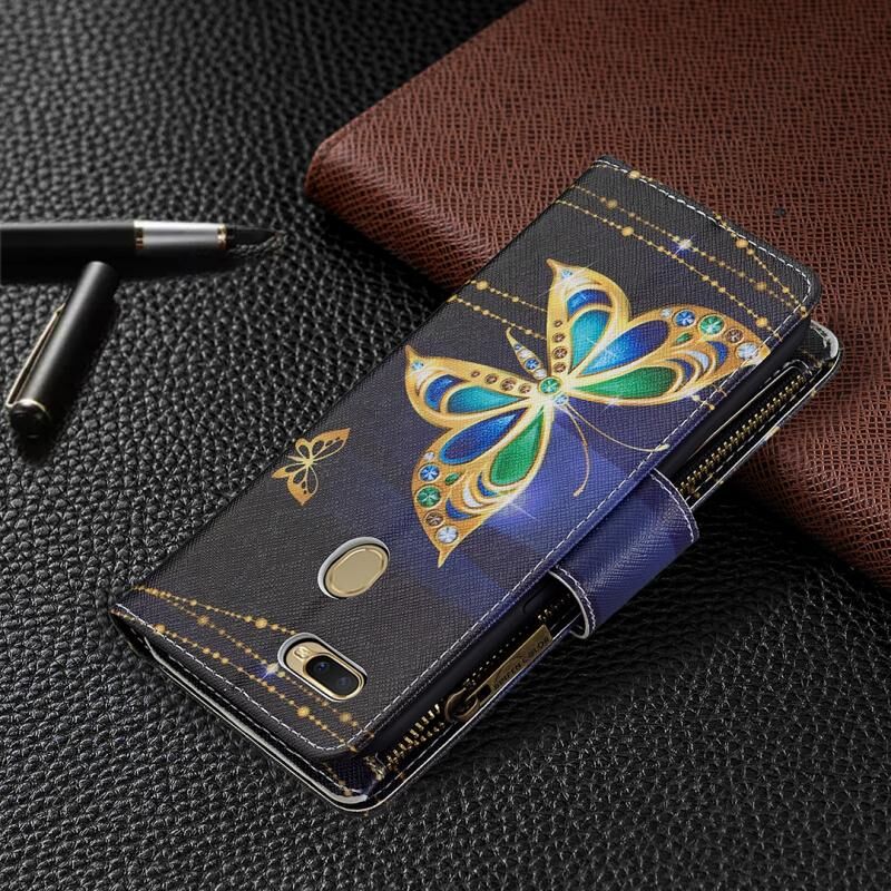 Θήκη δέρματος οριζόντιας αναδίπλωσης με φερμουάρ για OPPO A7 με έγχρωμο σχέδιο, βάση στήριξης, θήκες για κάρτες & πορτοφόλι (Μεγάλη Πεταλούδα)