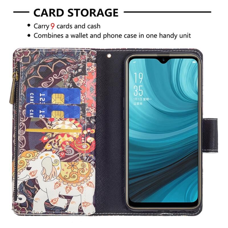 Θήκη δέρματος οριζόντιας αναδίπλωσης με φερμουάρ για OPPO A7 με έγχρωμο σχέδιο, βάση στήριξης & θήκες καρτών & πορτοφόλι (Λουλούδια & Ελέφαντες)