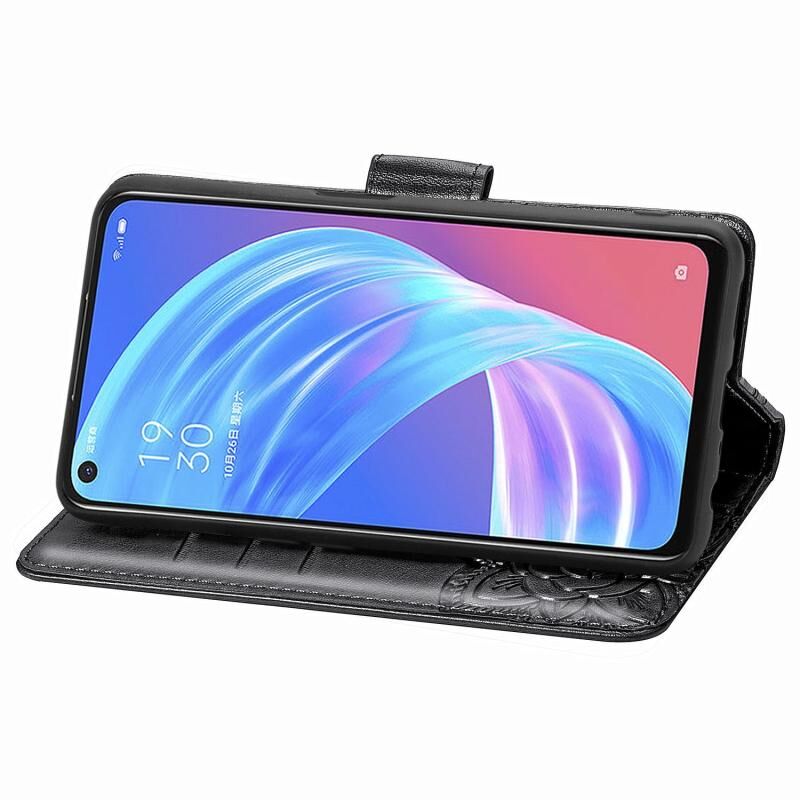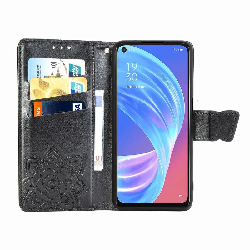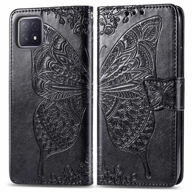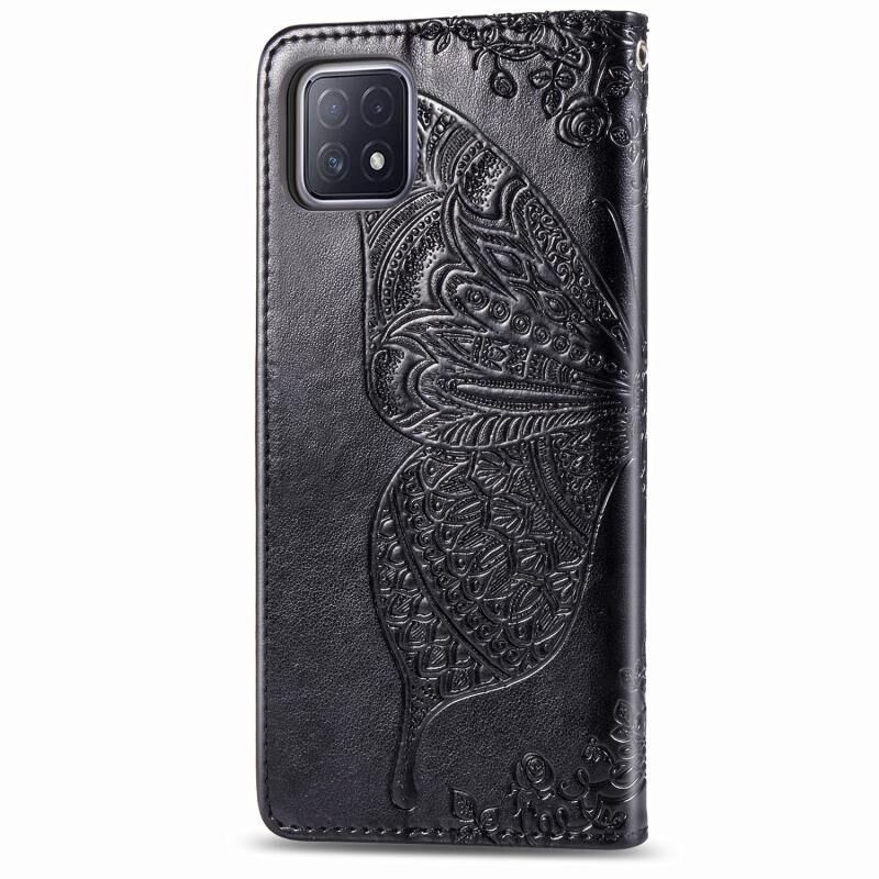 Θήκη βιβλίου από δέρμα με οριζόντιο άνοιγμα για Oppo A72 5G με ανάγλυφο σχέδιο πεταλούδας και λουλουδιών, με βάση στήριξης / υποδοχή κάρτας / πορτοφόλι / κορδόνι (Μαύρο)