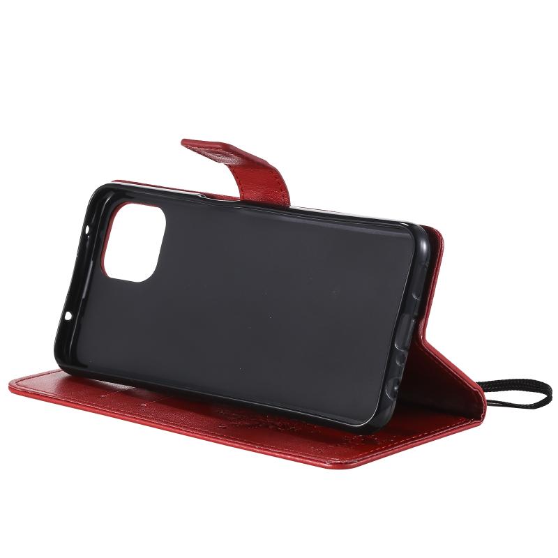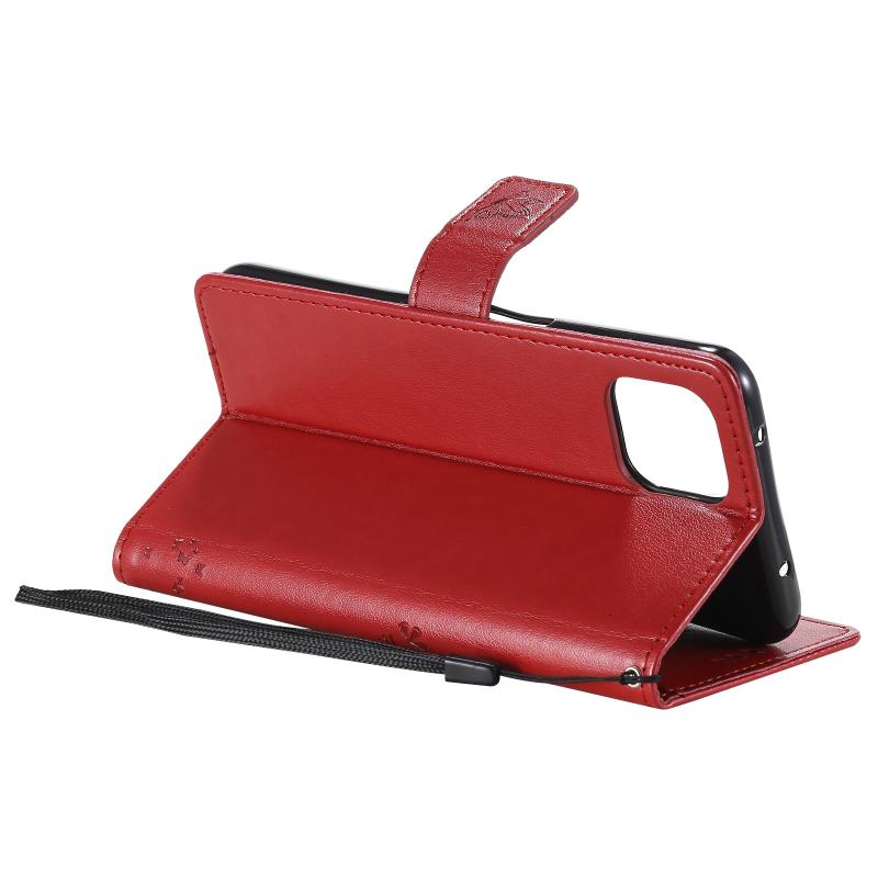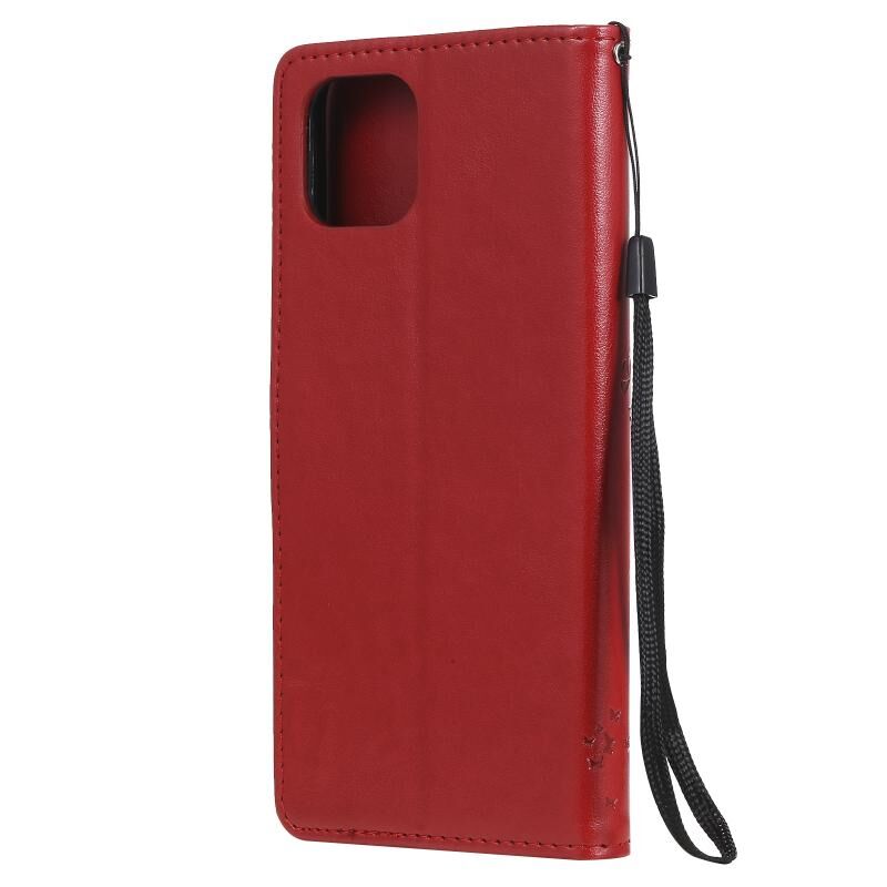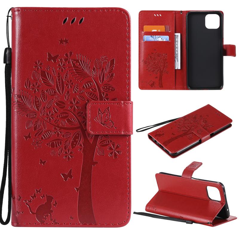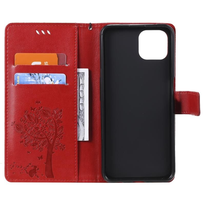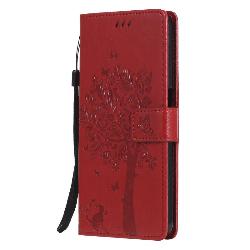 Θήκη για OPPO A73 5G με σχέδιο Δέντρου & Γάτας, εκτυπωμένη με θερμοτύπηση, οριζόντια αναδιπλούμενη από δερματίνη PU με βάση στήριξης & θήκες για κάρτες & πορτοφόλι & κορδόνι (Κόκκινο)