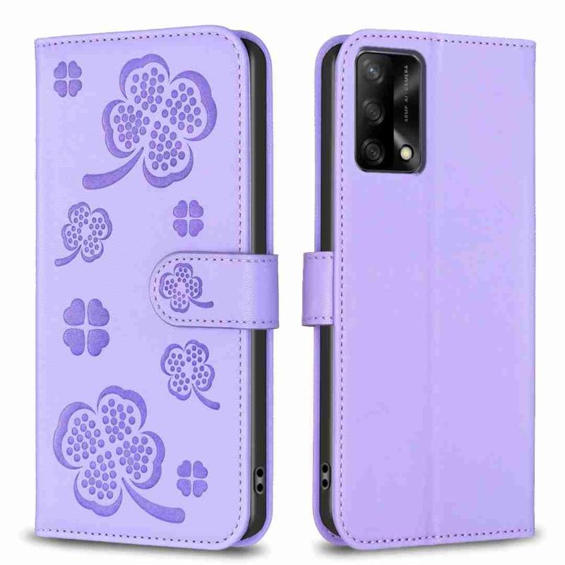 For OPPO A74 4G / F19 4G Four-leaf Embossed Leather Phone Case(Purple)