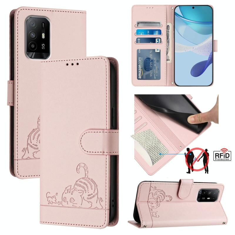 Θήκη τηλεφώνου από δέρμα με ανάγλυφο σχέδιο γάτας και ποντικού για OPPO A74 4G / F19 / F19S με κορδόνι (Μέντας Πράσινο)