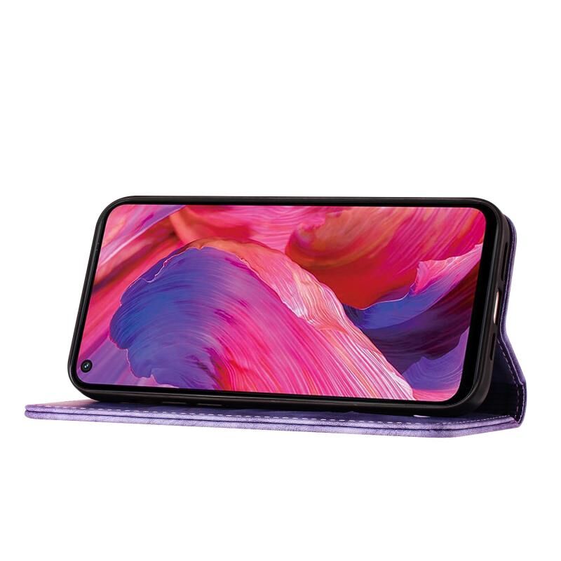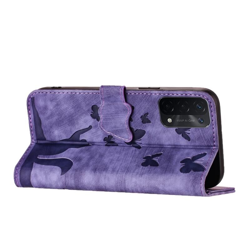 Θήκη τηλεφώνου από δέρμα με ανάγλυφο σχέδιο πεταλούδας και γάτας για OPPO A74 5G / A54 5G / A93 5G (Μωβ)