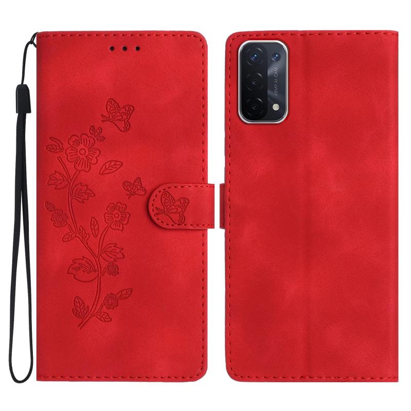 Θήκη τηλεφώνου από δέρμα με ανάγλυφο σχέδιο λουλουδιών και πεταλούδας για OPPO A74 / A54 / A93 5G (Κόκκινο)