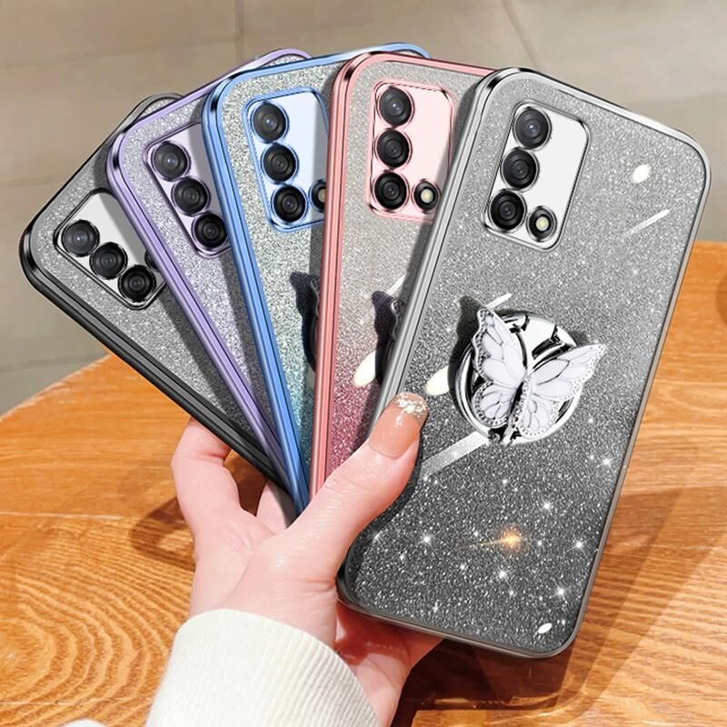 Για OPPO A74 Επιμεταλλωμένο διαβάθμιση Glitter πεταλούδα κάτοχος TPU τηλέφωνο υπόθεση (ροζ)
