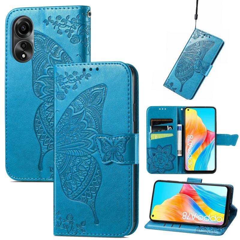 Θήκη τηλεφώνου από δέρμα με ανάγλυφο σχέδιο πεταλούδας και λουλουδιών για OPPO A78 4G (Μπλε)