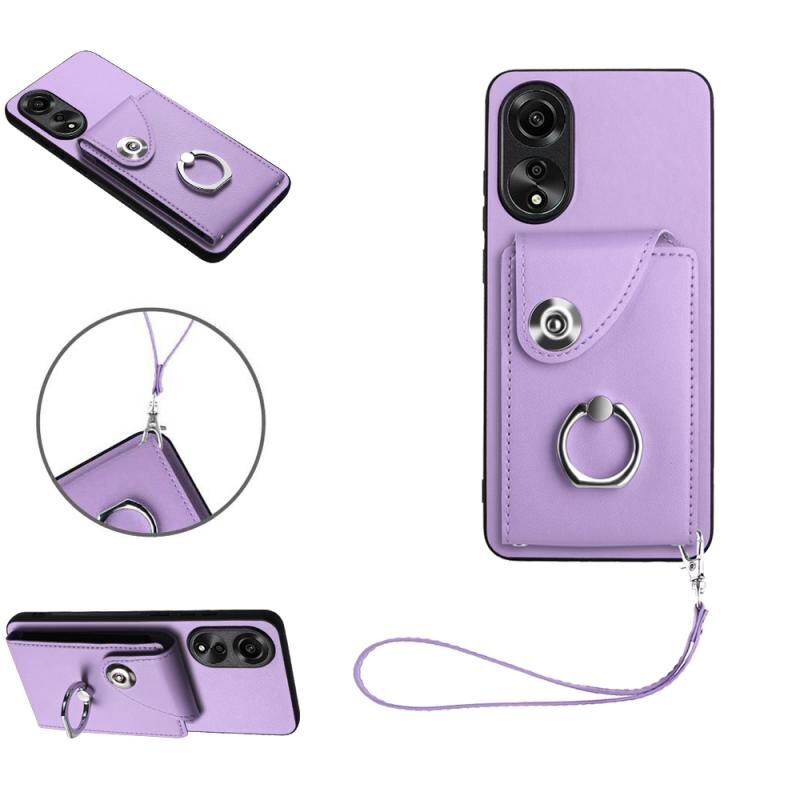 Για OPPO A78 4G Παγκόσμια Οργανική κάρτα τσάντα δαχτυλίδι τσάντα κάτοχος PU υπόθεση τηλεφώνου με κορδόνι (μωβ)