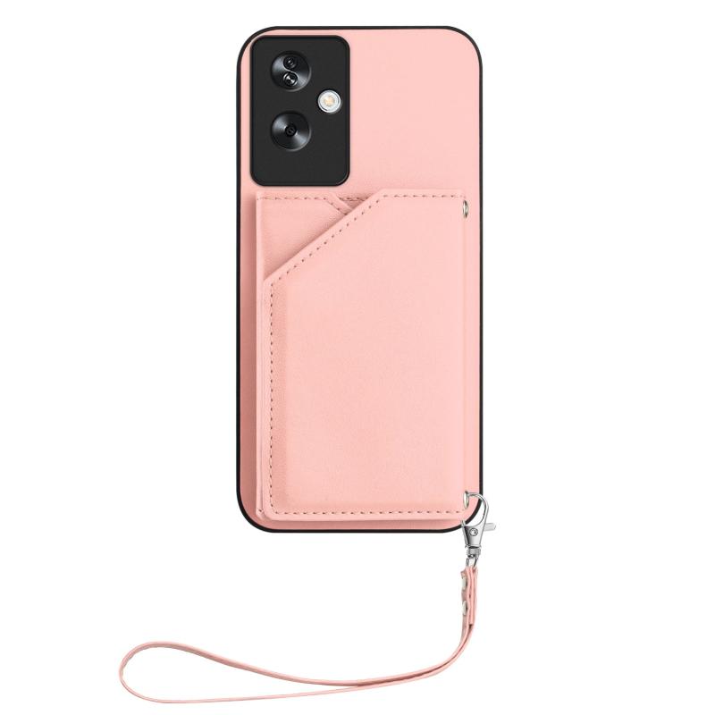 For OPPO A79 5G Global Skin Feel Four Card Slots Phone Case with Wrist Strap(Pink)