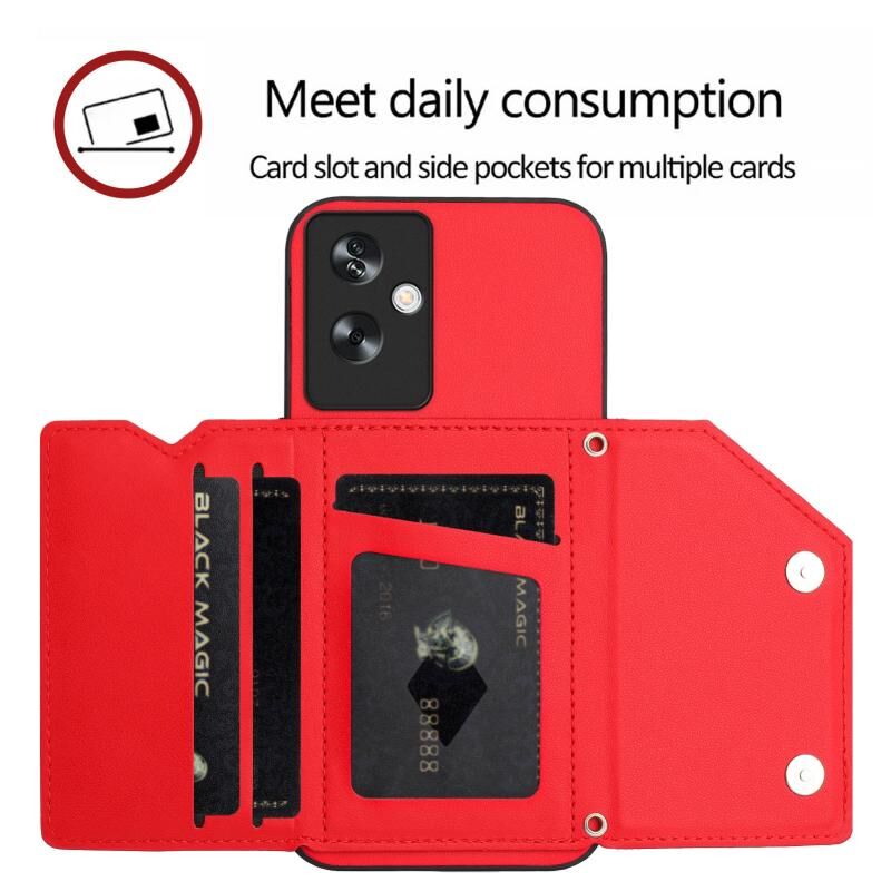 Θήκη τηλεφώνου για OPPO A79 5G Global με αίσθηση δέρματος, τέσσερις υποδοχές καρτών και λουρί καρπού (Ροζ)