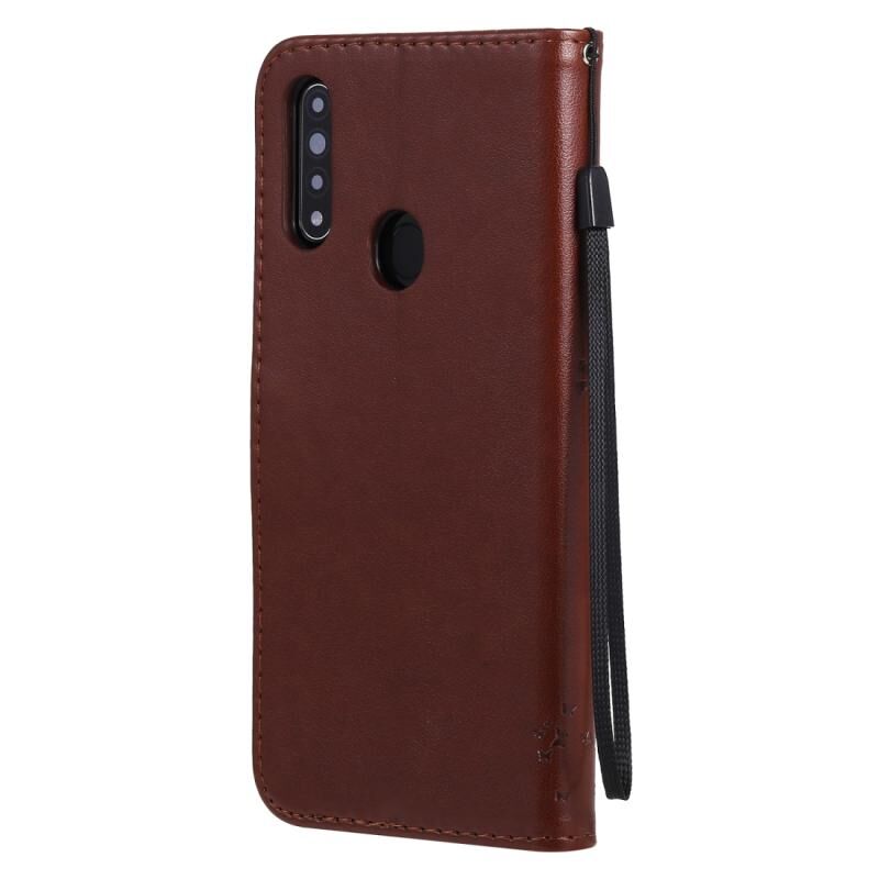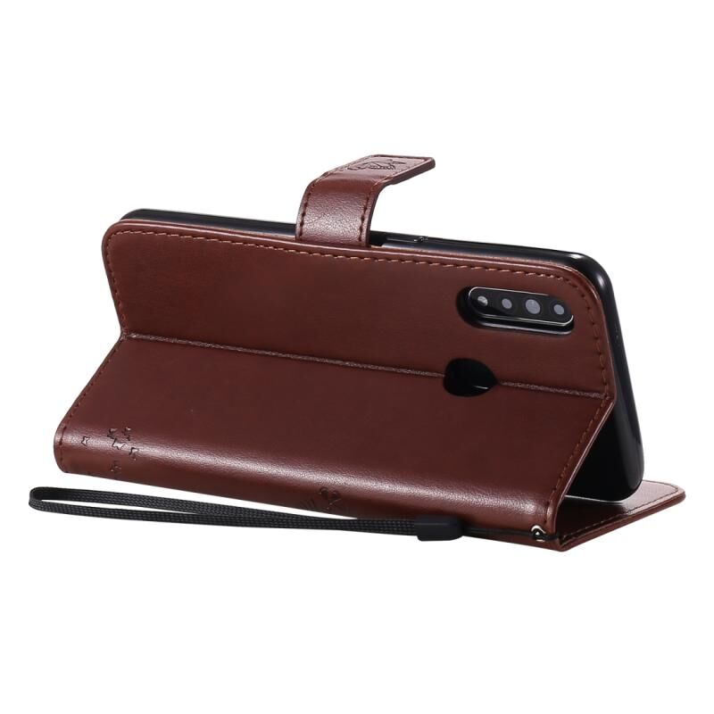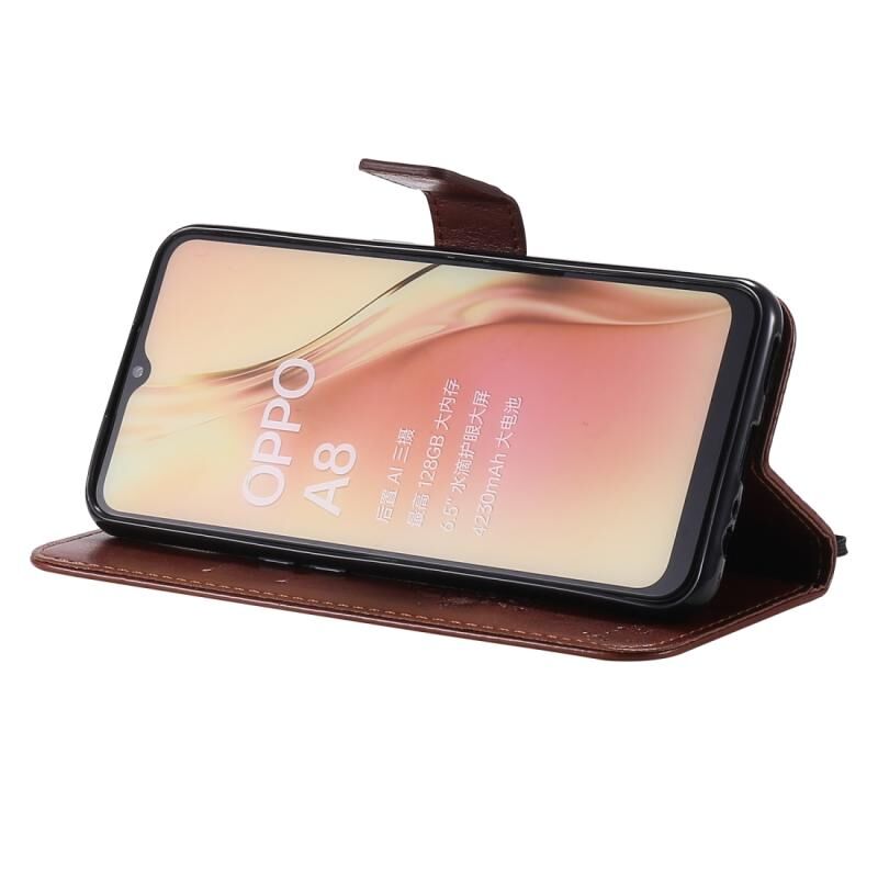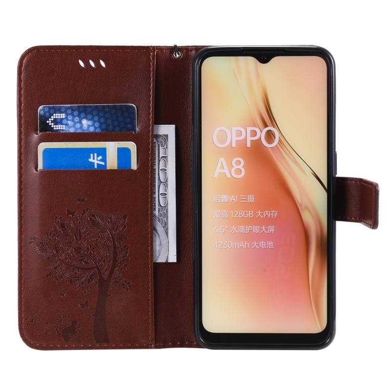 Θήκη για OPPO A8 / A31 (2020) με σχέδιο Δέντρου & Γάτας, με εκτύπωση υπό πίεση, οριζόντια αναδιπλούμενη από δερματίνη PU με βάση στήριξης & θήκες καρτών & πορτοφόλι & κορδόνι (Καφέ)