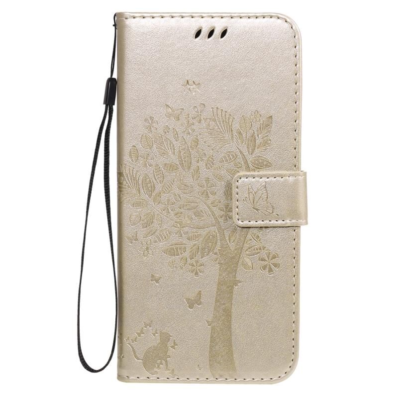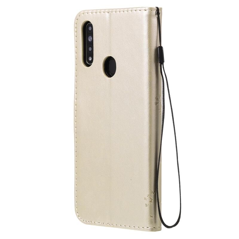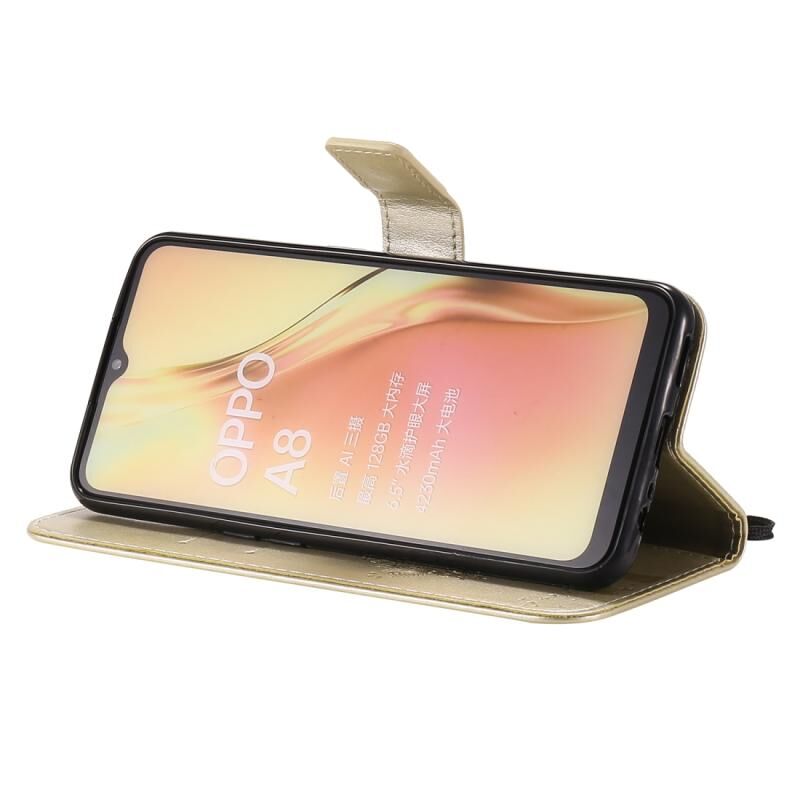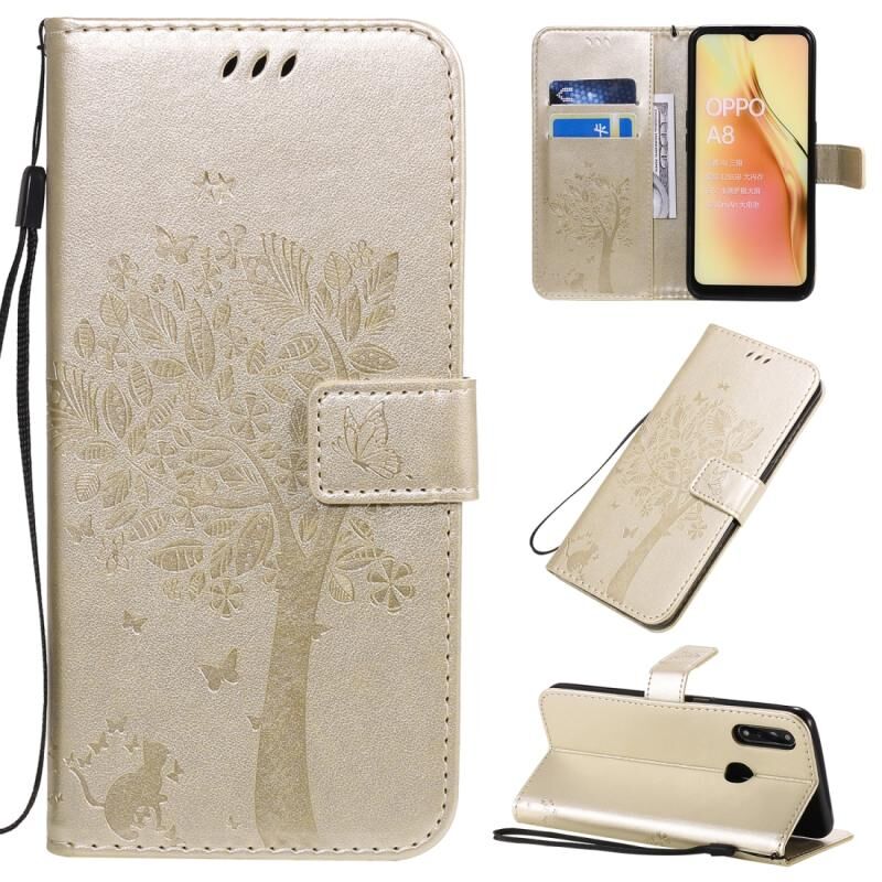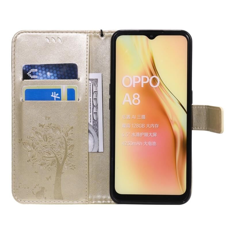 Θήκη για OPPO A8 / A31 (2020) με σχέδιο Δέντρου & Γάτας, με εκτύπωση υπό πίεση, οριζόντια αναδιπλούμενη από δερματίνη PU με βάση στήριξης & θήκες καρτών & πορτοφόλι & κορδόνι (Χρυσός)