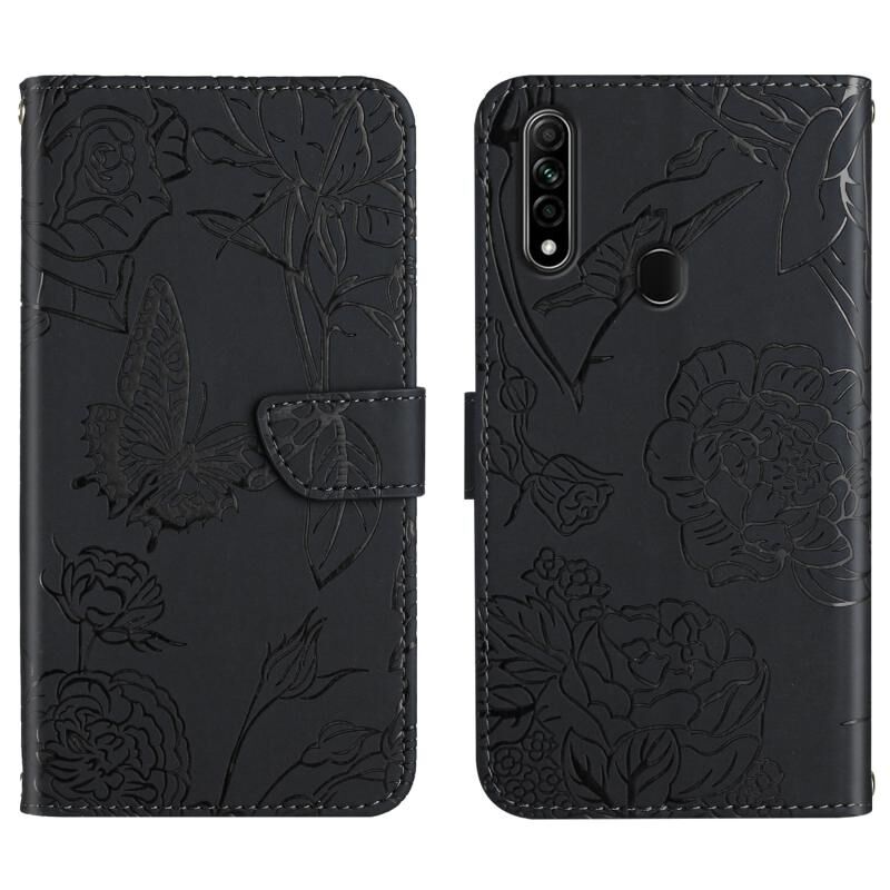 Θήκη τηλεφώνου από δέρμα με ανάγλυφο σχέδιο πεταλούδας και παιώνιας για OPPO A8 (Μαύρο)