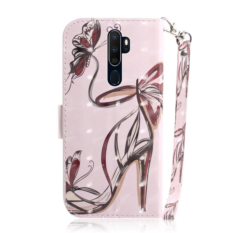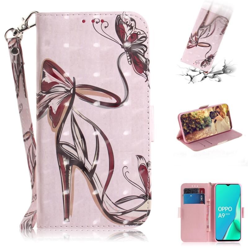 Θήκη δέρματος οριζόντιας αναδίπλωσης 3D με έγχρωμο σχέδιο για OPPO A9 2020 με βάση στήριξης & υποδοχές καρτών & πορτοφόλι & κορδόνι (Πεταλούδα με ψηλοτάκουνα)